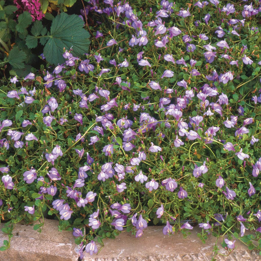 A Mazus reptans variety, commonly called creeping mazus, Mazus purple has a fast growth rate12+ inches a yearand a low growing, spreading habit. Super tough and durable, creeping mazus is an effective replacement for turfgrass in moist locations, such as along streams and creeks and around ponds and water gardens. It withstands light to medium foot traffic, so it's a good filler between paving stones. Creeping mazus also makes a nice bed and border plant and looks especially lovely cascading from a container or hanging basket.