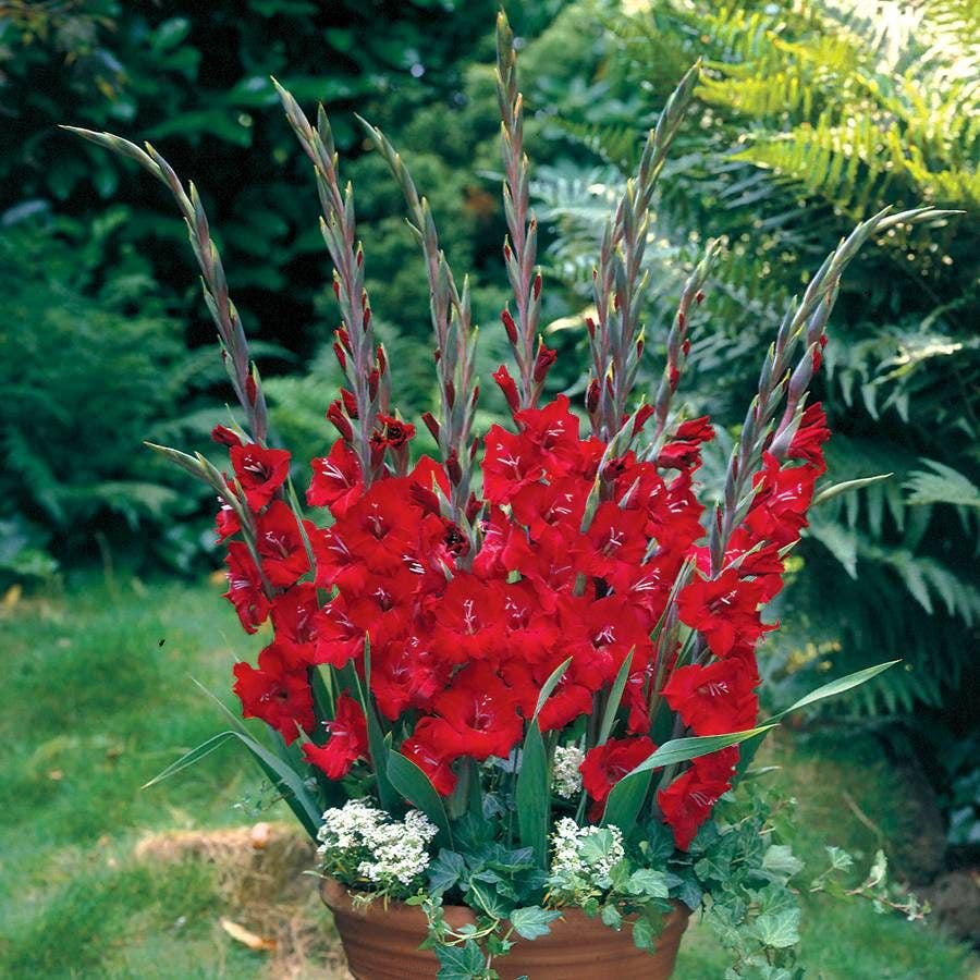 - Description / Gladioli Glamini® Tom Bulbs- Paint your summer garden red with these phenomenal sword lilies.The ideal addition to sunny summer gardens, this scarlet beauty boasts full sized ruffled flowers on strong compact stems that don't need staking and make excellent cut flowers. Not only are they fantastically lovely, but they are also quite eager to please and bloom earlier and longer than most other gladioli. These glads will burn brightly all throughout summer, but for colder zones the bulbs must be dug up in autumn and preserved through winter. They can then be replanted to continue their gorgeous legacy the following year. Make room in your garden for these petite yet impactful perennials and you won't be disappointed! To ensure the continued life of these bulbs in cooler zones (3-7) dig up the bulbs and store them through winter then replant them the following spring.