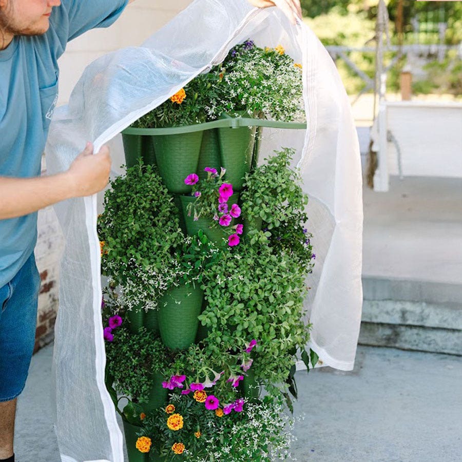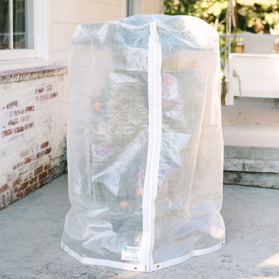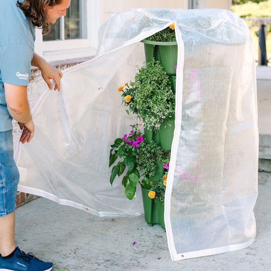 - Description / GreenStalk Frost Protection Cover- Made in USA - The GreenStalk Frost Protection Cover protects all of your plants in the GreenStalk Vertical Garden Planter or GreenStalk Complete Vertical Garden from unexpected cold snaps. This innovative woven polypropylene material maintains an extra 8 degrees of warmth but still breathes and allows 68 percent of sunlight through. With that added bit of sunlight protection, this frost cover can also help prevent plants from scorching in hot summer sun. - The GreenStalk Frost Protection Cover is produced in the USA using the highest quality materials available and with product longevity first in mind. It is made to withstand abuse from the weather over time and to resist the critters who visit the garden. It's sewn with very strong stitching using outdoor-rated, UV stable thread and bindings. The sturdy, marine-style molded zipper, which runs from top to bottom for easy watering and maintenance, maintains a watertight seal. And the grommets (for optional drawstring use [string not included]) resist rust. It features a circular top seam to prevent pulling on plants and is easy to maneuver when tending and harvesting plants. - For best results, use the GreenStalk Frost Protection Cover with at least one GreenStalk Plant Support (sold separately) to keep the fabric lifted and away from touching the plants. This frost cover can also be used to protect your shrubs and trees. - Dimensions - Measures 5' x 5' seam to seam - WARNING: This product can expose you to chemicals that are known to the State of California to cause cancer and birth defects or other reproductive harm. For more information go to www.P65Warnings.ca.gov.