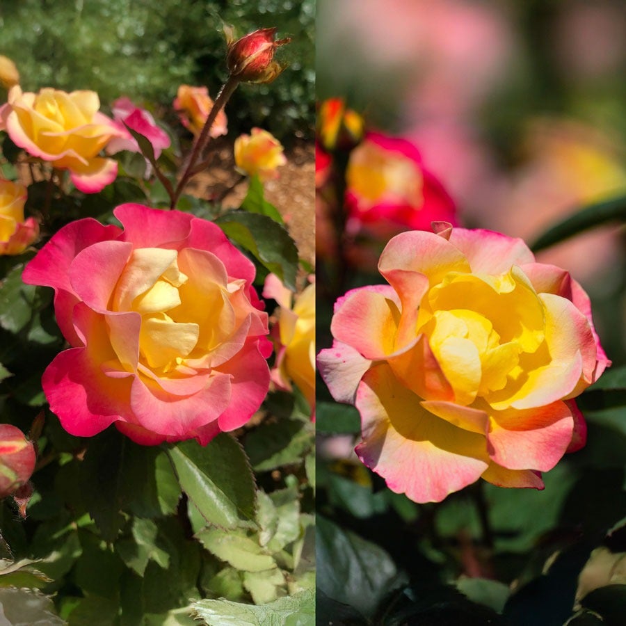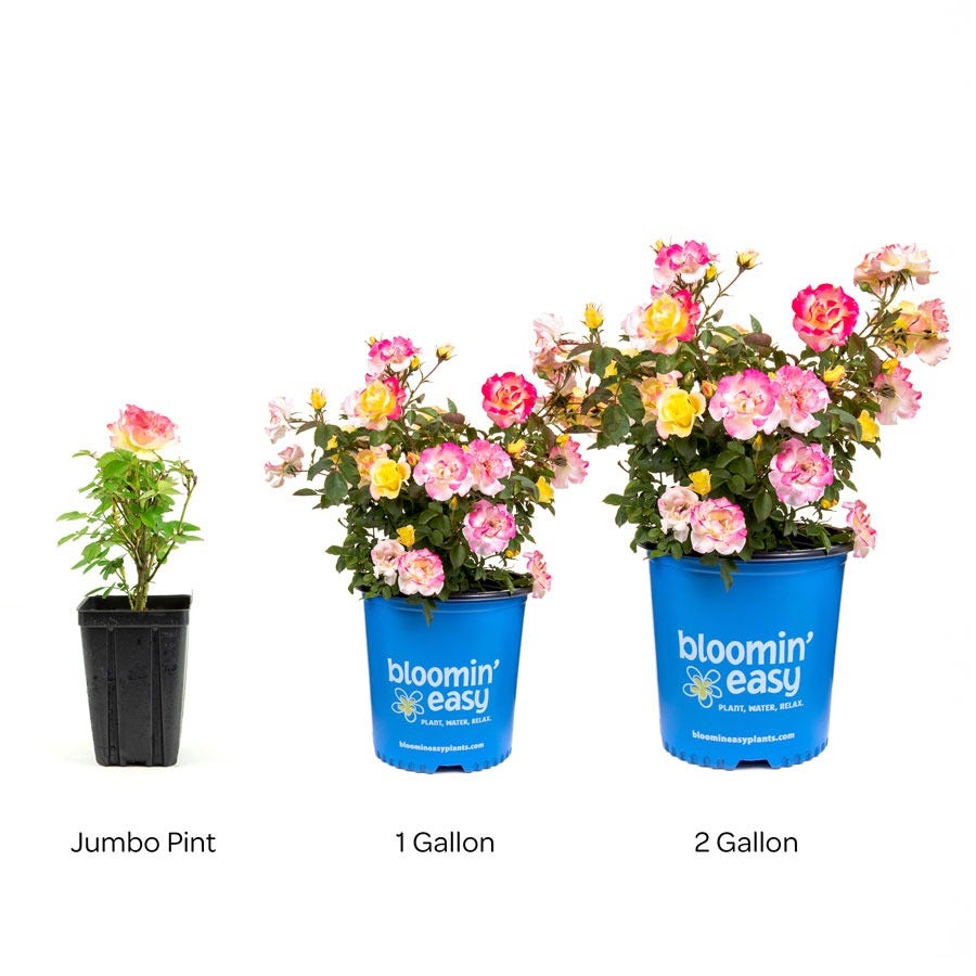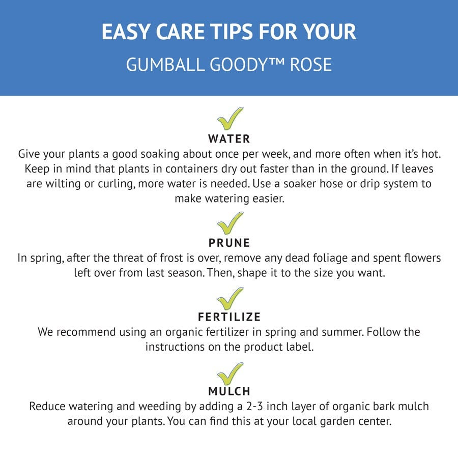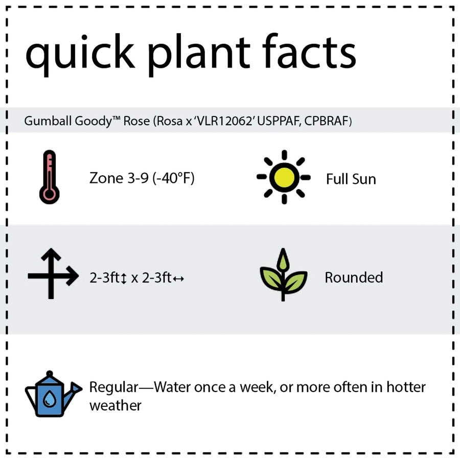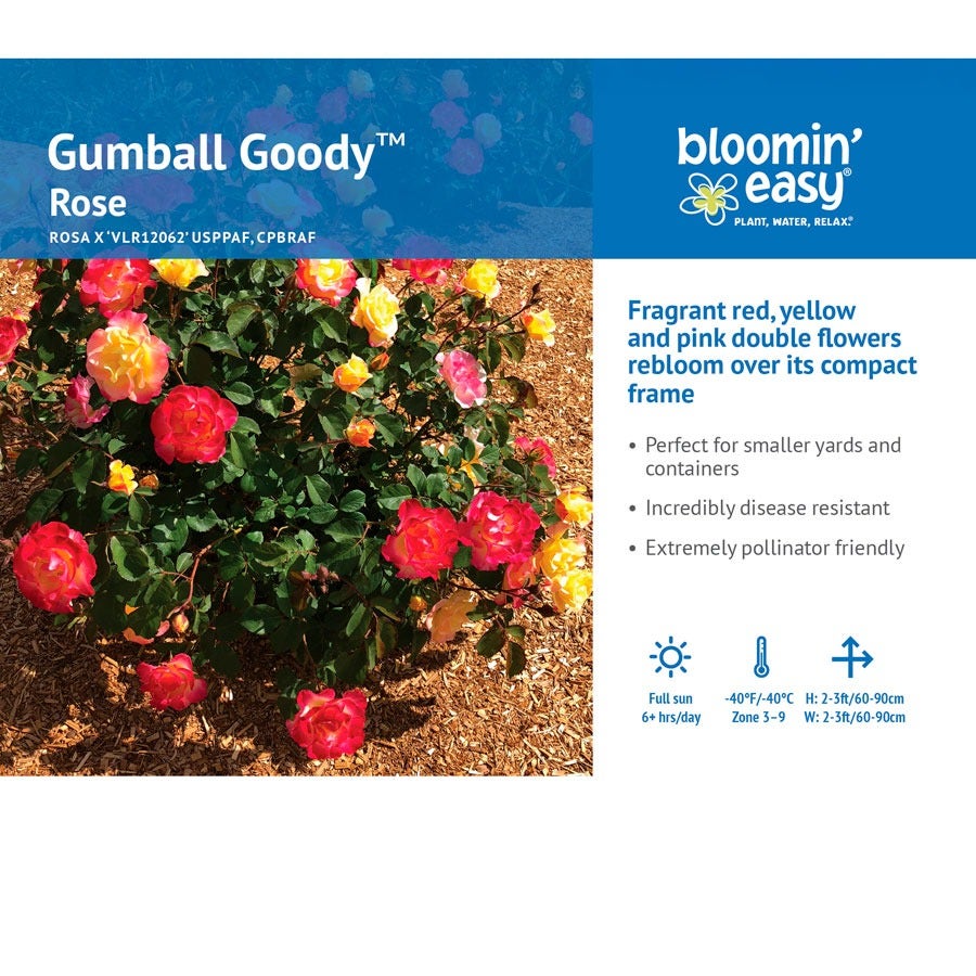 - Description / Gumball Goody™ Rose- A Bloomin' Easy® variety, Rosa Gumball Goody™ is a petite landscape rose that grows 2 to 3 feet tall and wide. Long and continuously blooming, Gumball Goody sets dazzling red-pink-and-yellow double blooms throughout the growing season, from spring to first frost. Borne in clusters, the ruffled flowers repeat rapidly, attract bees and butterflies to the garden, and make whimsical cut flower bouquets or additions to floral arrangements. - Gumball Goody has a compact habit of medium green foliage. A striking specimen plant, this rose works well in a patio pot but is shown to best effect when massed or grouped in beds and borders. - Easy to grow and maintain, Gumball Goody grows best in locations with full sun and average soil that's moist but well-draining. Gumball Goody is very adaptable and naturally resistant to common diseases but should be spaced with good air circulation. Deadheading is not required for continuous bloom. - 3 Options: Customizable Shrub Sizes for Every Landscape - Jumbo Pint: A perfect starter plant for patient growers.