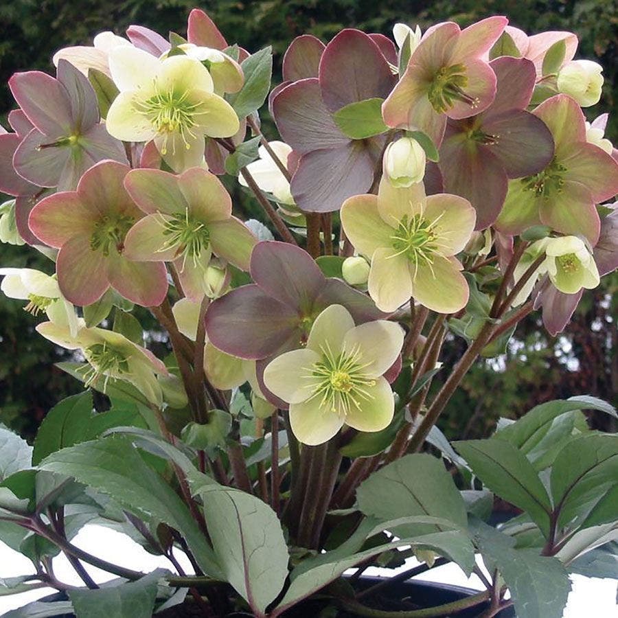 - Description / Helleborus 'Candy Love'- Helleborus 'Candy Love' is an evergreen perennial offering year-round interest, except in extremely cold locations. Incredibly floriferous and long-lasting, Helleborus 'Candy Love' flowers heavily for weeks, from late winter to late spring. The large, 3- to 4-inch, saucer-shaped flowers open pale creamy apricot, gradually darken to blush pink, and mature to dusty purple tinged pink and red. Borne in multicolored clusters on purple stems, the outward facing flowers, unusual for a hellebore, make adorable kitchen table bouquets or lovely additions to cut arrangements. - This vigorous herbaceous plant, also known as a Lenten rose or hellebore, has a tidy, low, mounding habit and a fast growth rate. The bushy foliage is leathery and dark powdery gray green. - Easy to grow, Helleborus 'Candy Love' prefers full to dappled shade and rich, humusy, neutral to alkaline, moist, well-drained soil. It is very tolerant of a wide range of soils, including chalk, clay, and loam, and growing conditions but will not tolerate extremely dry or waterlogged soils. It is disease and deer resistant. - For best effect, consider planting in groups in beds, borders, patio containers, or under a high-branched deciduous tree or large shrub, protected from strong winter winds. The plant makes a lovely groundcover and slowly expands via rhizomatous roots, but will not become invasive, and self-seeds in ideal growing conditions.