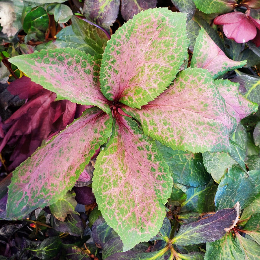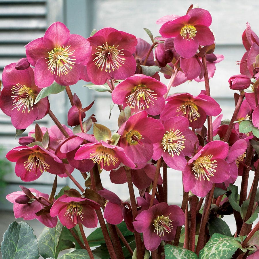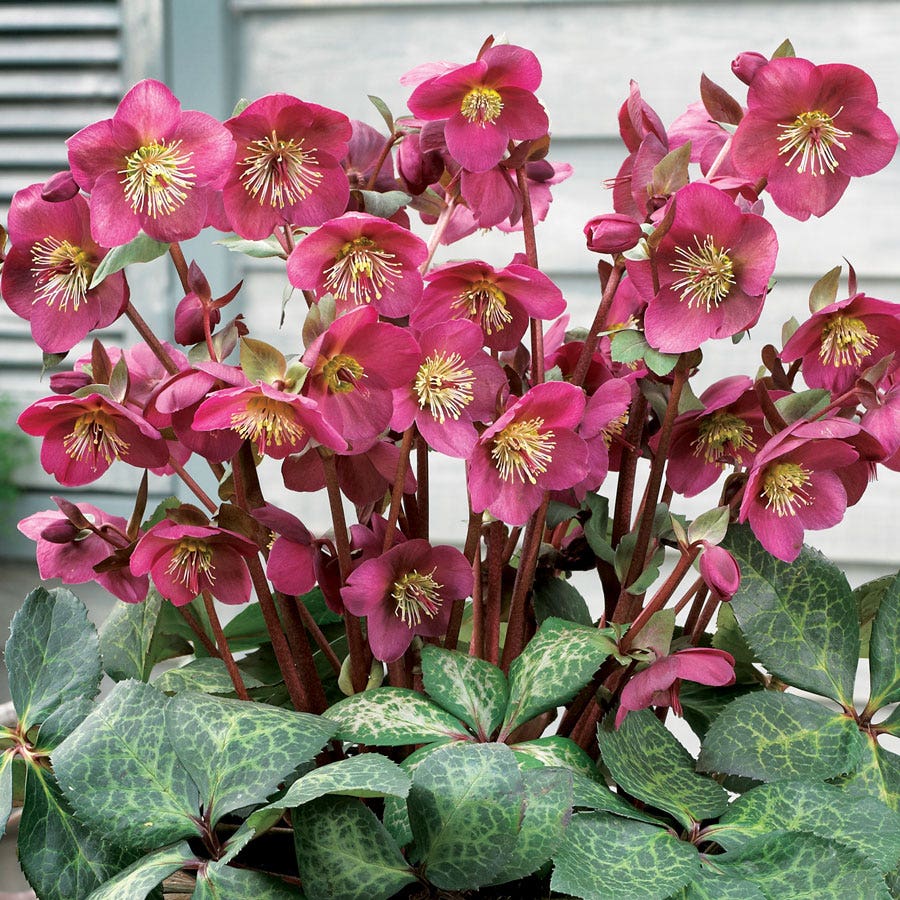 - Description / Helleborus Frostkiss® Anna's Red Hellebore- The Helleborus Frostkiss® Anna's Red Hellebore stands as a beacon of beauty in any shade garden, offering an exquisite display of deep-burgundy flowers that bloom profusely from the winter through to the early spring. This evergreen perennial is a treasure in the garden, with its unique, marbled foliage that transitions from a bronze-green with vibrant pink veins in the spring to a mature cream variegation, perfectly complementing the rich color of Anna Pavord's namesake blooms. The long-lasting, nodding to outward-facing flowers are not only a sight to behold but also serve as a vital early food source for emerging bees, thanks to their nectar and pollen. - As a robust Helleborus hybrid, commonly referred to as the Lenten rose, Anna's Red exhibits vigorous growth and an upright, mounding habit. It shines when massed or grouped in garden beds, borders, or patio pots, and doubles as an enchanting ground cover that will naturally expand through its rhizomatous roots without becoming invasive. This variety is particularly striking when planted under the dappled shade of a high-branched deciduous tree or a large shrub, offering protection from the harsh winter winds. - Anna's Red is celebrated for its cold hardiness, ease of growth, and minimal maintenance requirements. It thrives in dappled shade environments with organically rich, moist, yet well-draining soil, adaptable to a neutral to alkaline pH. Remarkably resilient, it can grow in a variety of soil types, including chalk, clay, and loam, and withstands different growing conditions. Once established, it demonstrates drought tolerance, although it does not fare well in overly wet conditions. Additionally, it is resistant to deer and rabbits. - Helleborus are early blooming evergreen perennials with nodding flowers that delight in your winter garden. Follow our expert's advice on Hellebore Planting and Care and learn more about these long-lived plants in our blog All About Hellebores.
