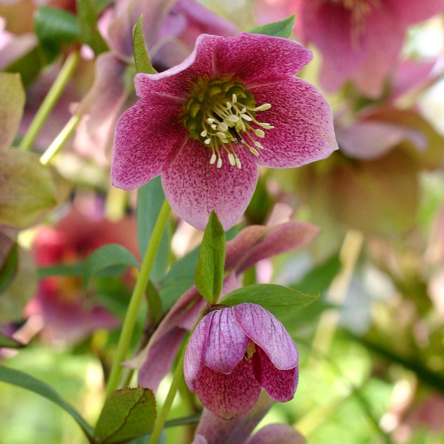 - Description / Helleborus 'Red Mountain'- Expressive rosy pink blossoms with white veins and charmingly jagged petals is what you can expect from this unique hybrid perennial. Its evergreen foliage is lush and deer-proof and serves as a handsome backdrop to its unusually upturned blossoms. Like most Lenten Roses, 'Red Mountain' begins blooming in late winter, a little treat for the shade garden during a typically quiet season. The blooms continue until the peak of spring and seamlessly tie the seasons together while your other perennials begin to awaken form their winter's rest. Ample shade and rich, well-drained soil are the best conditions for this helleborus to thrive. Add it to your beds for a splash of color in the shady sections of your garden. Virtually disease-free and ignored by nearly all pests save slugs and aphids, the low maintenance nature of this plant only adds to its beauty and versatility.