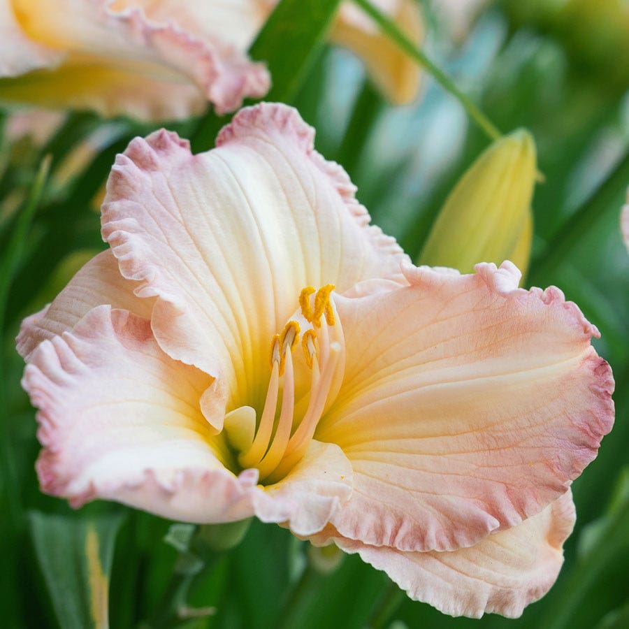 - Description / Hemerocallis 'Fairy Tale Pink' Daylily- Winner of the Stout Silver Medal 1990 (daylily's highest award) - Hemerocallis 'Fairy Tale Pink' Daylily is a deciduous perennial that blooms from mid to late summer. A romantic large flowered variety, 'Fairy Tale Pink' simply glows with its large 5½-inch pastel pink flowers with green throats and gently ruffled and recurved petals. Each flower lasts one day, but each plant contains several long scapes with multiple buds that open in succession. So, it blooms for weeks, attracting butterflies, bees, and hummingbirds. - A Hemerocallis hybrid, commonly called daylily, 'Fairy Tale Pink' has an upright, mounding habit and a medium growth rate. Daylilies are clump-forming and multiply freely and rapidly. The full, grass-like deep green foliage lends texture and color to the garden, so the plant is attractive even out of bloom. Although it is an excellent specimen, suitable for a container, daylily shows to best effect when grown in masses in large areas or in groups in beds and borders. - Cold hardy, easy to grow, and low maintenance, daylilies grow best in sunny to partly shady locations with deep, fertile, medium moisture, well-draining loams. But it is extremely adaptable and grows well in a wide range of soils, including poor and dry soils. It is drought tolerant and rabbit resistant.