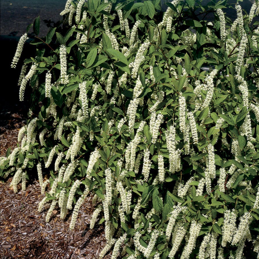 Just a few feet high and never more than 6 feet wide, 'Henry's Garnet' is a dense, mounded little shrub with appealing green foliage right down to the ground. Its white bottlebrush blooms begin appearing in late spring on long, dramatically dangling 6-inch stems that cover the shrub, opening their flowers from the base to the tip. Very sweetly scented, these blooms attract butterflies and bees to your sunny garden, and even hummingbirds have been known to pay their respects.