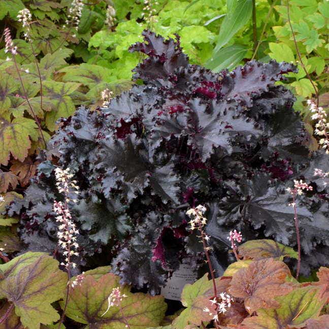 This Heuchera is a cross between 'Chocolate Ruffles' and 'Midnight Ruffles.' It features the dark, highly-ruffled look of both parents, but this time on larger, glossier leaves that maintain a warmer tone throughout the winter. The tops of the leaves are a burnished black while the bottoms are plum-colored, bringing some chocolaty warmth to the black color.
