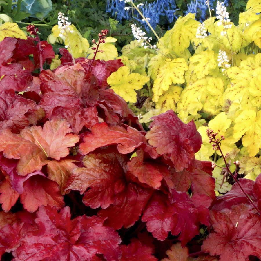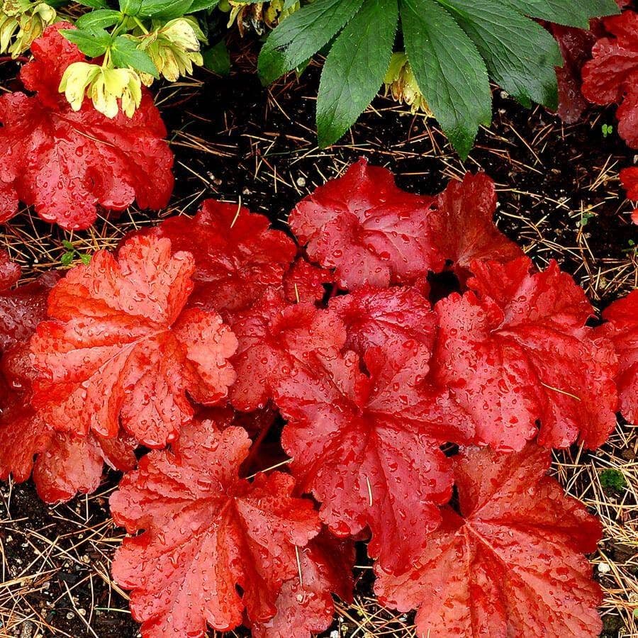 'Fire Alarm' is a smokin' hot heuchera with rich texture and bold everchanging color. Its thick, glossy, leathery leaves emerge bright red in spring, brown slightly during summer, and turn fiery red in fall. In early to midsummer, red stems shoot up spikes of small, bell-shaped, pink flowers. These colorful stalks attract butterflies and hummingbirds and make lovely "bits" in floral arrangements. Removing the faded flowers promotes additional blooms.