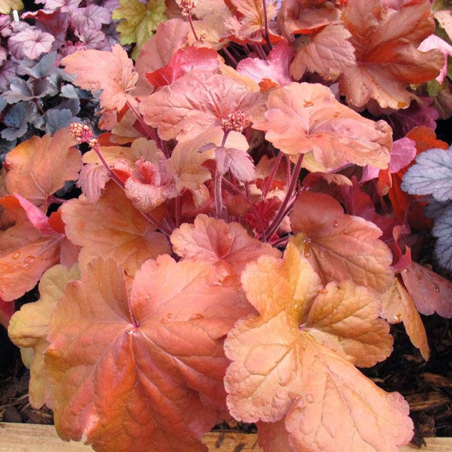 A clump-forming, semievergreen perennial, this cultivar of coral bells grows up to 12 inches tall and 24 inches wide, with flowers reaching 18 inches high. Requiring little maintenance, the plant grows easily and is salt and drought tolerant and deer and rabbit resistant.