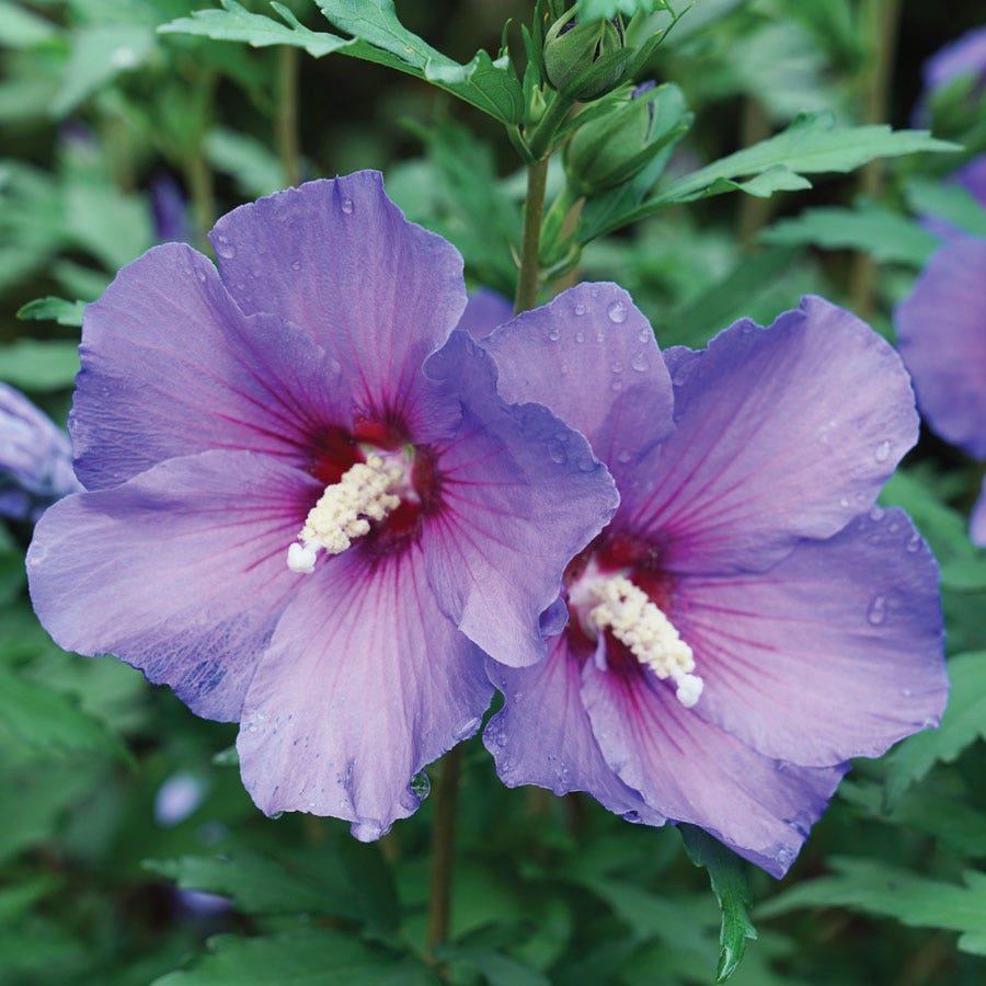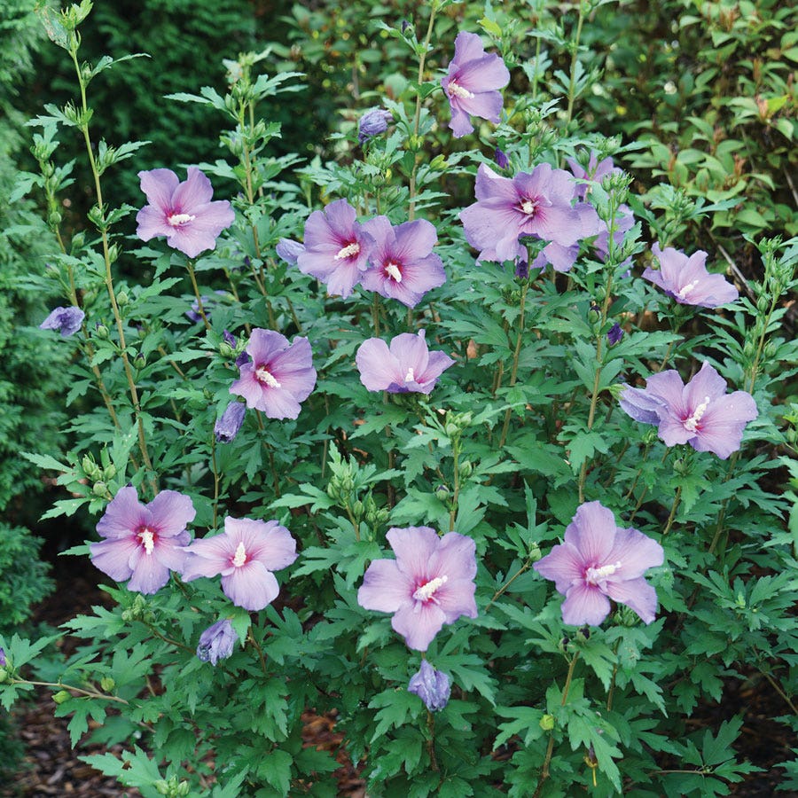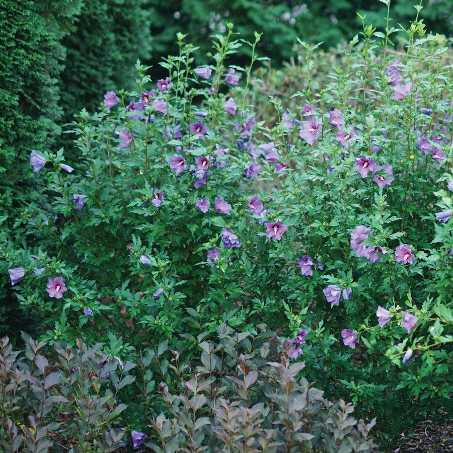 - Description / Hibiscus Paraplu Violet® Rose of Sharon- A Proven Winners® ColorChoice® Flowering Shrubs variety, Hibiscus Paraplu Violet®, commonly called rose of Sharon, grows large and lush and blooms in showy extra-large flowers from late summer until late fall. The alluring blooms are all the more impressive because they are borne high in the air on plants with an elegant habit that moves gracefully in the breeze. Intensely hued, the stunning blooms have a crimson eye and a unique lavender color that appears almost luminous and can only be fully appreciated in person. Even though this variety is seedless, it still produces enough nectar to attract plenty of bees, butterflies, and hummingbirds. - Hibiscus Paraplu Violet is a carefree joy you'll want for the hot, sunny summer garden. Few shrubs are more heat and humidity tolerant than hibiscus, which basks in temperatures that make others wilt and brown out. Give this shrub plenty of water and nonstop sunlight and you've got a bloom machine for about 5 months out of every year. - It is a great choice for a foundation planting, accent in the patio or other garden nook, or hedge. It makes a fine specimen and a nice background planting to dwarf Russian sage and other low-growing shrubs, as well as colorful annuals and perennials of all description. No shrub is easierthis is one tough plant, untroubled by pests, including deer, and disease and able to maintain itself through good weather and poor alike.