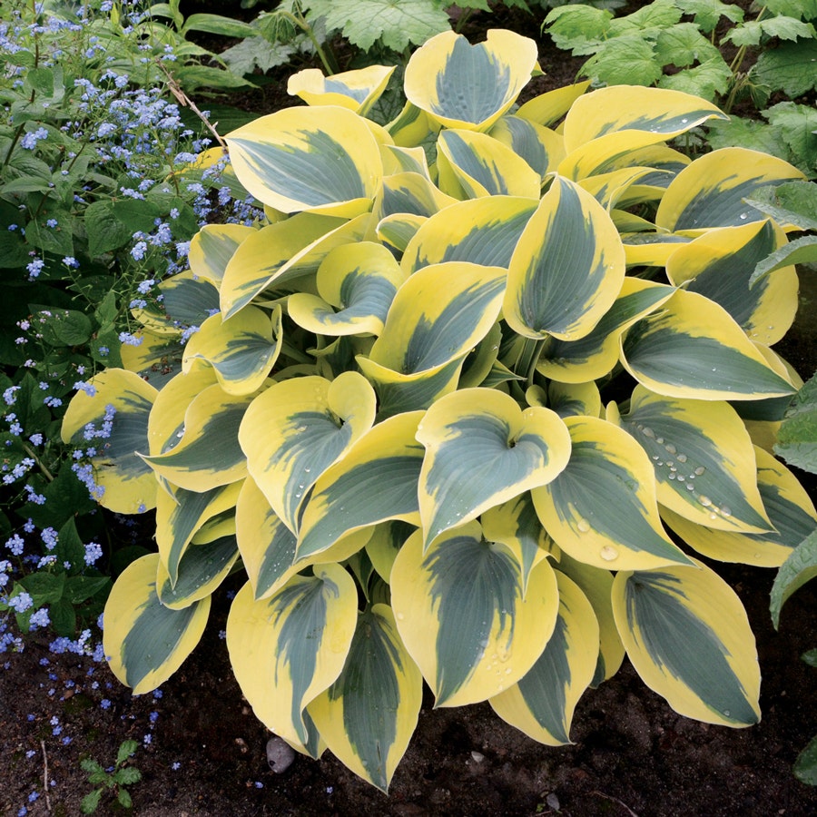 Give 'Autumn Frost' a special place in your garden. Best in half to full shade, it is a rare combination of steely blue and warm golden-yellow that really glows in low light. Combine it with yellow-, blue-, and purple-leaved plants for a terrific color show, or plant it in groups of 3 to 7 for a breathtaking display of lush, verdant foliage.