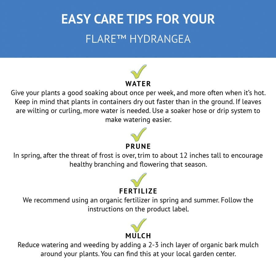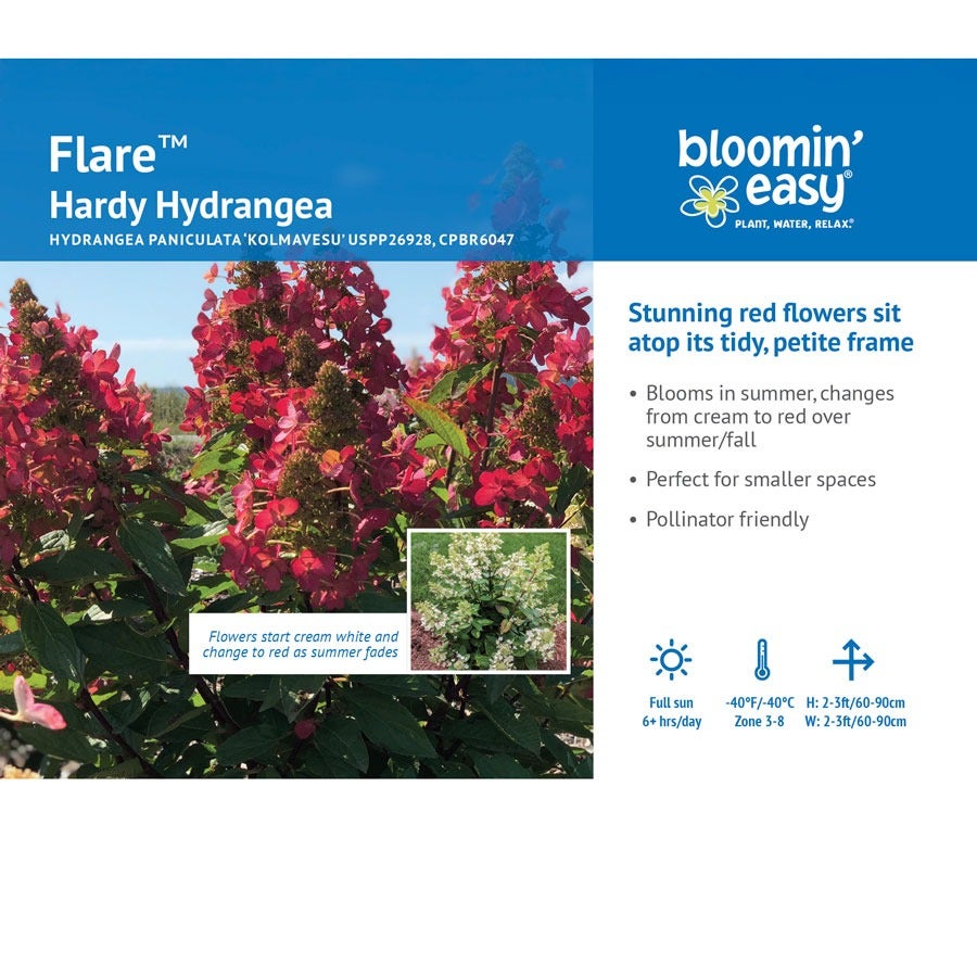 Add a little flare to your landscape with Hydrangea Flareā¢! One glance at the fiery red blooms of Flare⢠and there will be no turning back. Just like the flame of a smoldering fire it will attract stares from all guests to your outdoor space. It's very compact and showy so it does well in a walkway, in the middle of a border, or in a decorative patio container. Not only is it beautiful but it's low maintenance and so easy to care for, it even comes with optional care reminders! You can sign up and you'll receive a friendly seasonal reminder when it's time to mulch, fertilize, or prune your plant. Beauty and ease, what more could you ask for? Add Flare⢠to your garden today for a blaze of color that you will love! Use the code provided on your plant tag to sign up for Blooming Easy Care Reminders.
