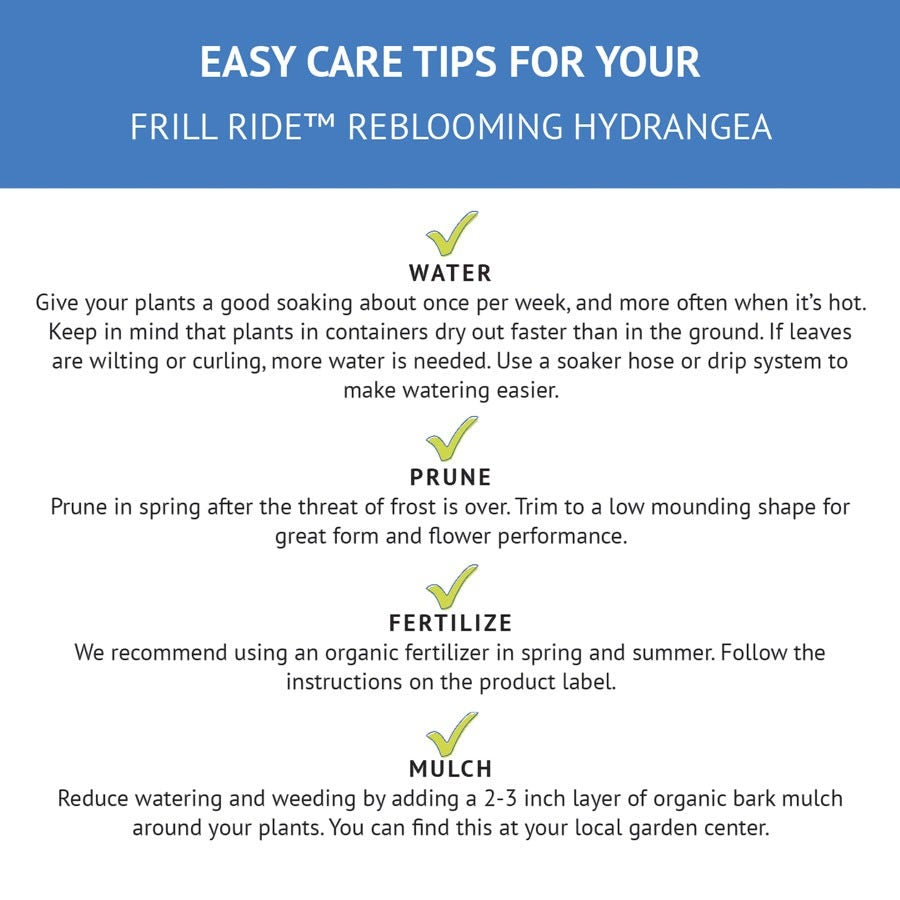Embrace the simplicity of growing and maintaining Frill Ride⢠Hydrangea. This shade-loving shrub prefers a balance of morning sun and afternoon shade, rich well-draining soil, and regular watering. Noteworthy is its exceptional heat tolerance, making it a resilient and low-maintenance choice for your outdoor haven. As a bonus, the blooms of Hydrangea macrophylla, like Frill Rideā¢, display a delightful color show influenced by the pH of the soil, turning pink in alkaline conditions and blue in acidic soils.