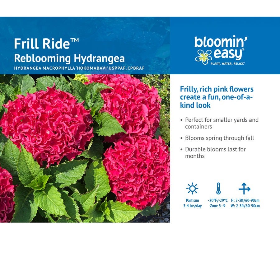 Indulge in the captivating beauty of Frill Ride⢠Hydrangea, a splendid offering from Bloomin' Easy® that ensures year-round interest in your garden. This bigleaf hydrangea stands out as a classic beauty, providing a season-long floral show that begins in late spring and extends through the summer. What sets it apart are the large mophead clusters adorned with uniquely ruffled dark pink/red florets, held proudly atop long, sturdy stems against a backdrop of fleshy, dark green foliage. These fun and frilly flowers are not just a momentary delight - they are long-lasting and ideal for both fresh and dried displays.