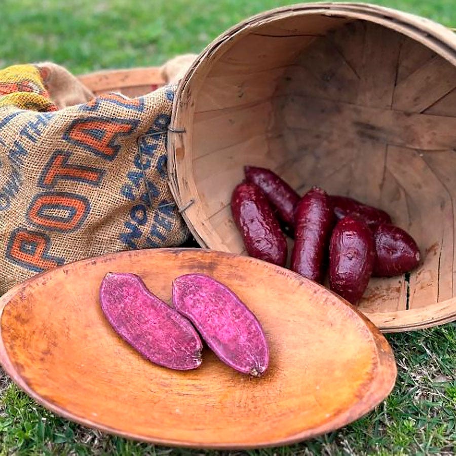 Purple Passion Sweet Potato is a root vegetable. The sweet potatoes have purple skin, purple flesh, and an elongated shape, similar to a cucumber, with a fairly consistent width for the full length of the potato. They make a colorful dish, especially when roasted with Murasaki and orange sweet potatoes. Sweet potatoes are considered a superfood for their nutrient rich content. They are an excellent source of vitamin A and a good source of vitamin C, dietary fiber, and potassium. Sweet potatoes also contain iron, calcium, protein, and beneficial amino acids. Purple Passion is rich in anthocyanin too.