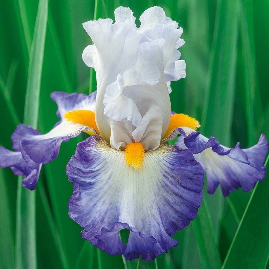 Get ready to be stunned by Iris germanica 'Brilliant Idea'. This iris is a pure white flower edged with rich, bright blue along it's ruffled petals contrasted against deep orange beards. Iris germanica 'Brilliant Idea' stands tall on sword-like medium green foliage and is surprisingly easy to grow: The best time to plant bearded iris is July through September. This will allow them to become well established before winter. Container-grown iris can be planted in the spring.