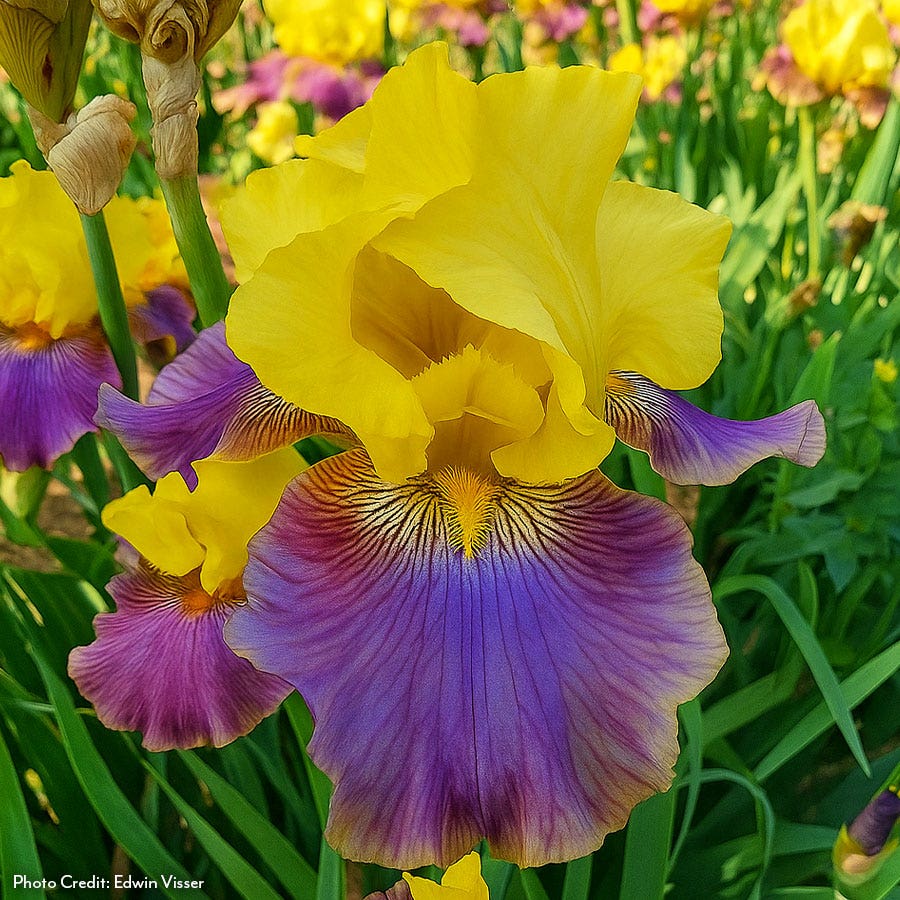 Few sights are as captivating as the elegant color medley of Iris Sunrise at Sea unfurling in the garden. With golden-yellow standards, violet-freckled falls, and bold gold beards, its ruffled blooms make a splash not once, but twice a season. Standing tall at 36 inches, this reblooming bearded iris adds height and texture to beds and borders, with broad fans of upright green foliage that stay attractive even after blooms fade.