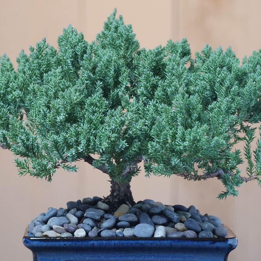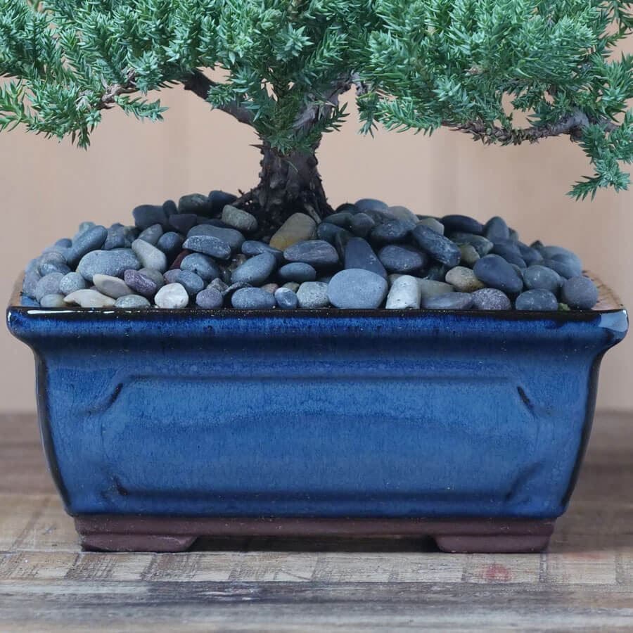 A living sculpture, the Juniper Bonsai Tree is a petite version of the full size tree that has been artfully trained to a height of 6 to 8 inches and retains the same fluid lines. Our sleek blue ceramic container with a glazed finish creates a handsome display for a desk or shelf.