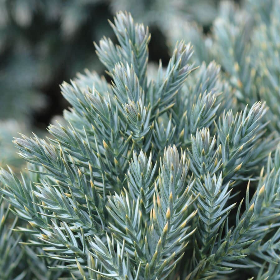 These graceful evergreen shrubs form compact, irregular mounds of dense, overlapping whorls of awl-shaped steely blue green foliage, each needle edged with a white band. Although low growing, Juniperus 'Blue Star' can reach 2 to 3 feet high over time.