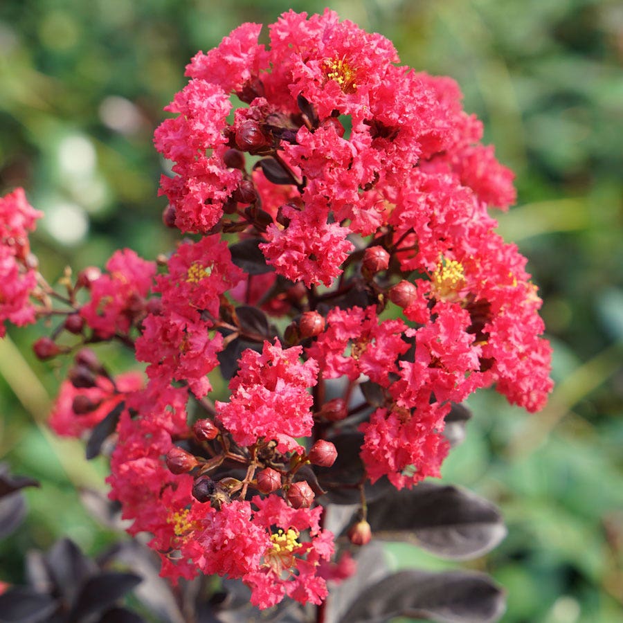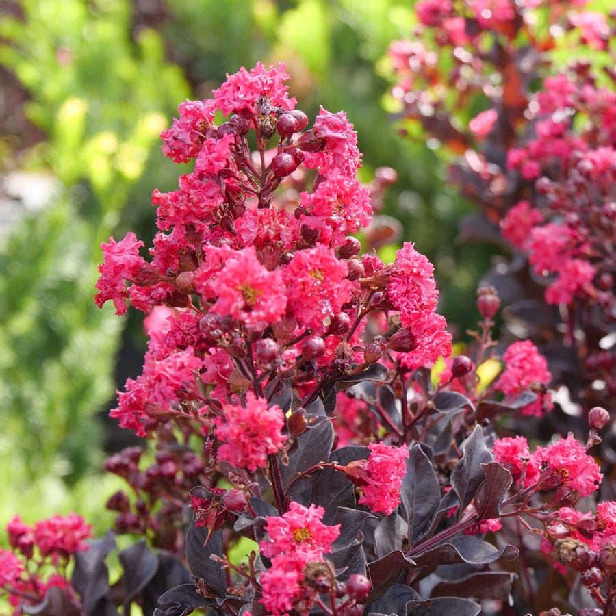 A Proven Winners® ColorChoice® Flowering Shrubs variety, Lagerstroemia Center Stage® Pink Crapemyrtle is a deciduous shrub or small tree that blooms summer to fall, sometimes to first frost. Long and heavy blooming, the plant flowers in terminal clusters of crepe-papery, intense magenta pink flowers set against a dramatic backdrop of thick, leathery black leaves that hold their intense color into fall. The flowers attract pollinators, especially bees, in summer, and its handsome exfoliating bark offers winter appeal.
