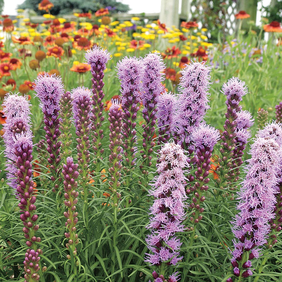 Absolutely indispensable for the meadow garden, wildflower groupings, and the sunny border, Liatris 'Kobold Original' grows just 14 inches high but boasts long, flower-packed stems that open (unusually) from the top down, keeping the plant in color for many weeks in mid- to late summer. The blooms are a rosy shade of lavender, held elegantly above whorled, narrow foliage. They make excellent cut flowers, and bring in butterflies by the dozen during their long season of glory.
