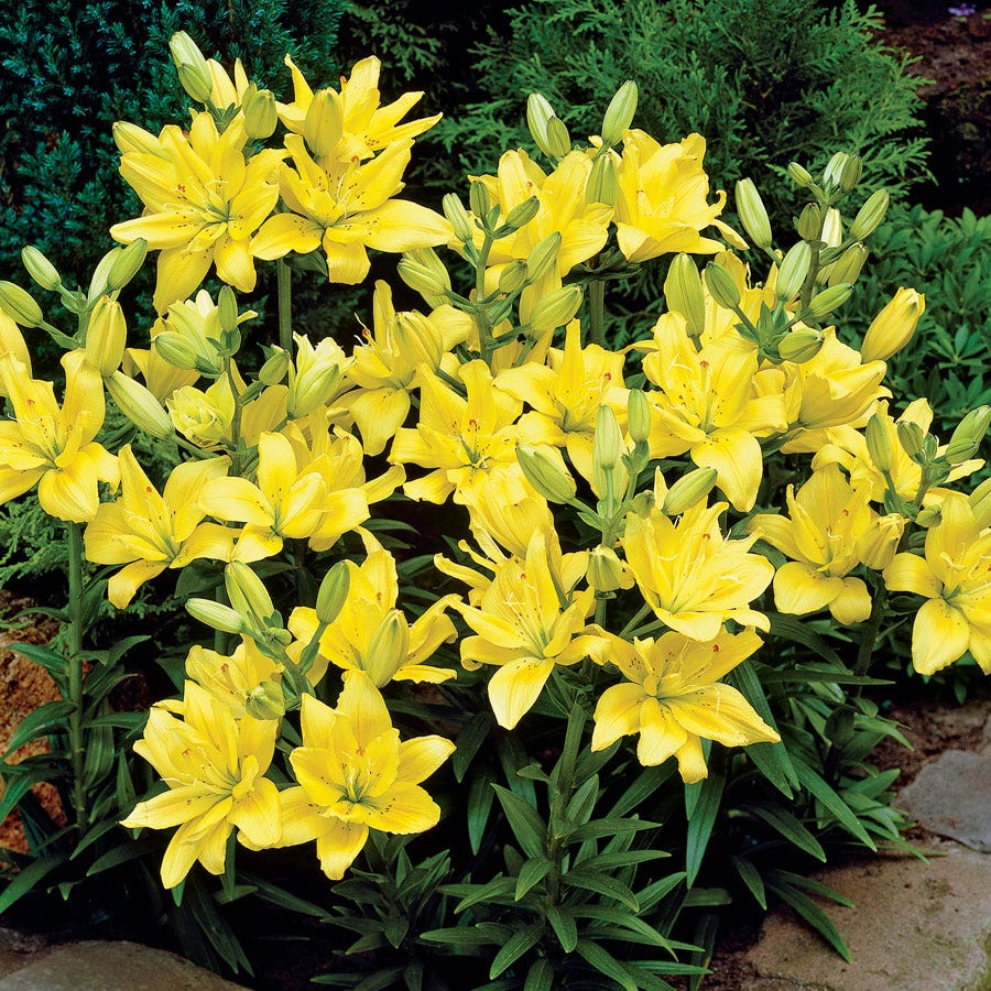 Plant Lilium 'Fata Morgana' Asiatic Lily in early spring, and in midsummer, it blooms in large, 4- to 6-inch, bright yellow double flowers. Borne 5 to 7 per rigid stem, the flowers make excellent cuts for floral display. Although the flowers are not fragrant, double blooms mean no messy, staining pollen to worry about when bringing them indoors.