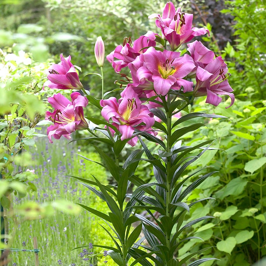 A Lilium x asiaticum, commonly called tree lily, 'Purple Lady' is a hardy perennial (Zones 5-9) that can remain in the ground all winter, making it an excellent choice for gardeners in cooler climates. Its upright habit makes it ideal for planting in groups or masses, whether in garden beds, borders, containers, or patio pots. 'Purple Lady' tree lily is also highly valued in cutting gardens, where its prolific, huge, and colorful blooms stand out as stunning cut flowers.