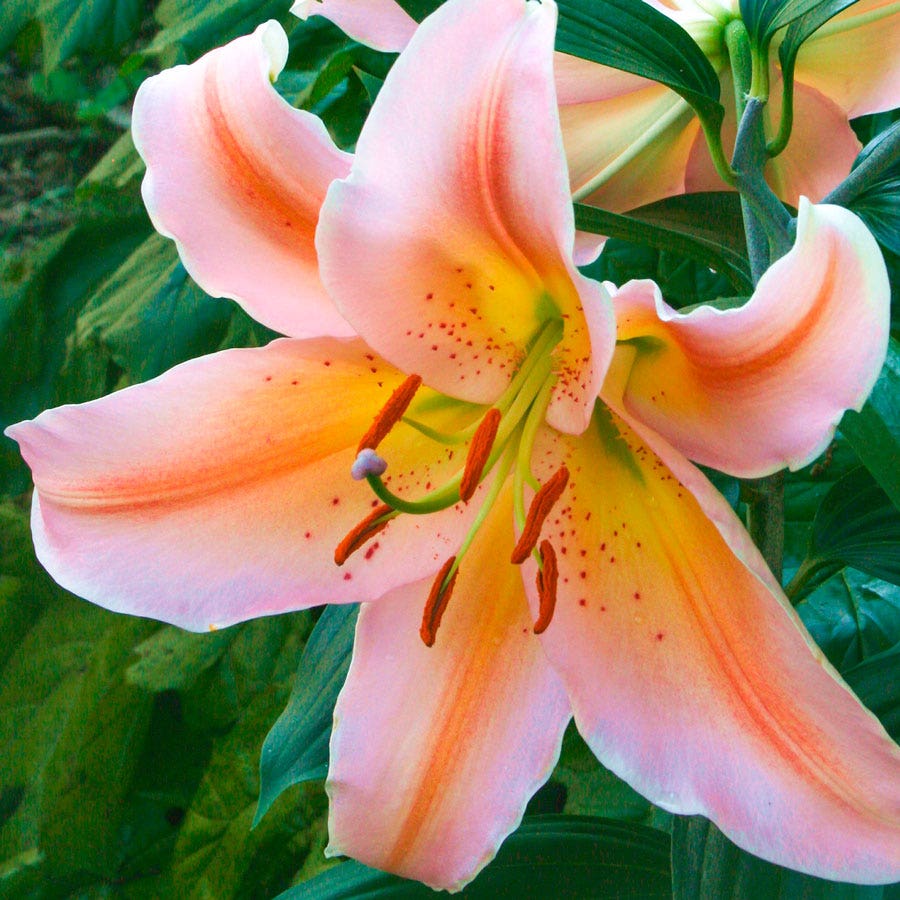 Plant Lilium 'Salmon Party' in very early spring, and in late summer, it blooms in enormous star-shaped flowers with a pronounced orange band and red speckles on petals suffused in blushed shades of peachy salmon and pink. Borne on long, erect, unbranched stems layered in strappy leaves, the extremely showy and spice-scented blooms make excellent cut flowers.