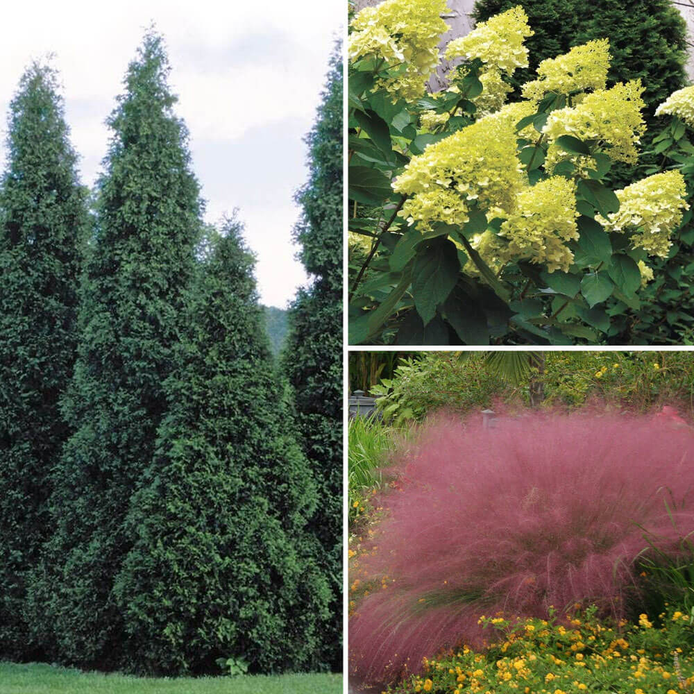 The Living Fence Pre-Planned Garden Kit includes plants in 2‑quart pots: 2 Thuja 'Green Giant', 1 Hydrangea 'Limelight', and 3 Muhlenbergia Pink Muhly Grass in 1-quart pots (6 Plants Total), designed for full sun gardens in zones 5 to 9. These selections create living structure with a tall evergreen backbone from the thujas, a large panicle bloom from the hydrangea, and airy texture with the pink muhly grass, producing both privacy and layers in the landscape.
