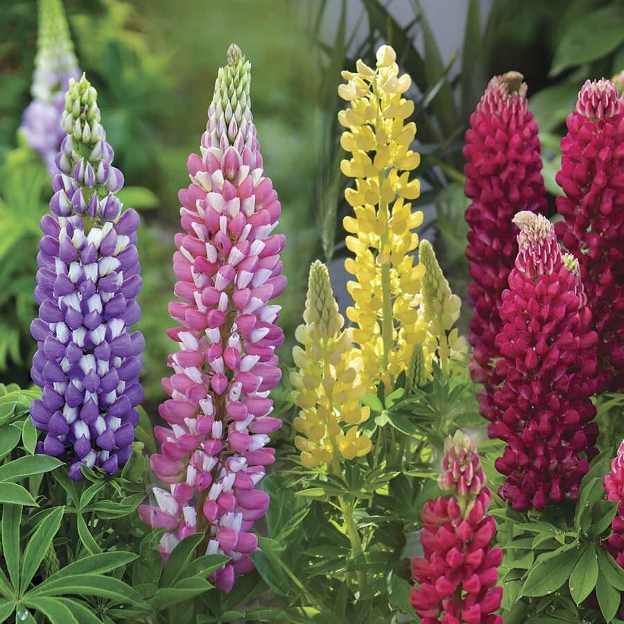 This Lupini mix contains 5 colors: purple, yellow, white, pink, and red. The compact plants produce long flower spikes that rise above perfectly palmate green foliage. The plants work well in a border, mixed bed, or container. They're also suited to rock gardens. Wherever they are planted, they attract hummingbirds and butterflies.