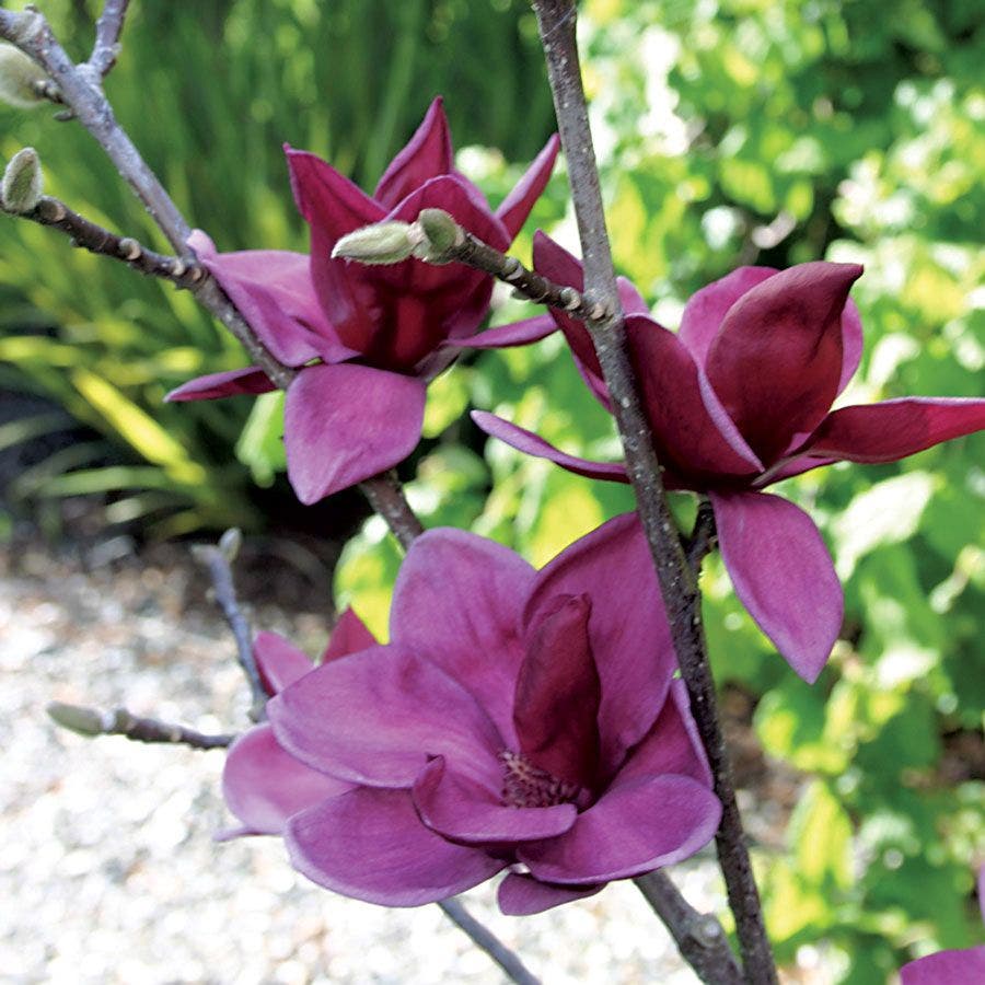The blooms begin as striking blackish-red buds, help upright and very prominent on this well-branched little tree. They open into tulip-shaped blooms of dark maroon with reflexed tips of lighter magenta. Subtly scented with a sweet, rich aroma, they are indescribable in the vase, and stand out in the spring garden like beacons in the night.