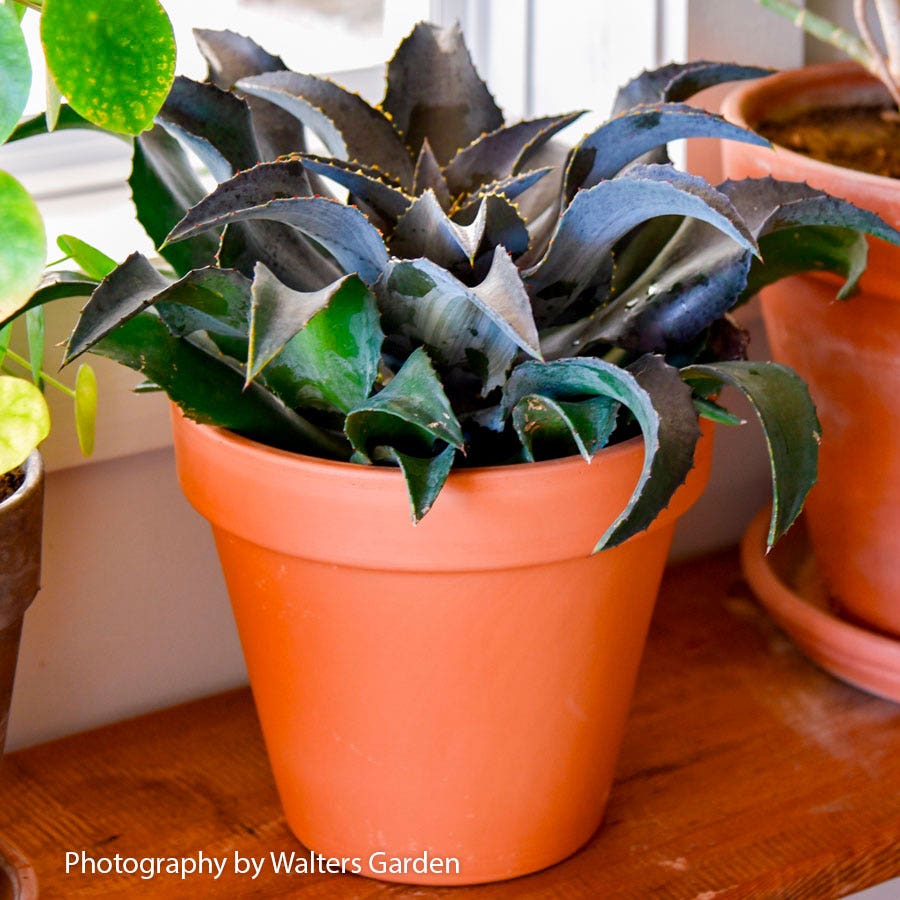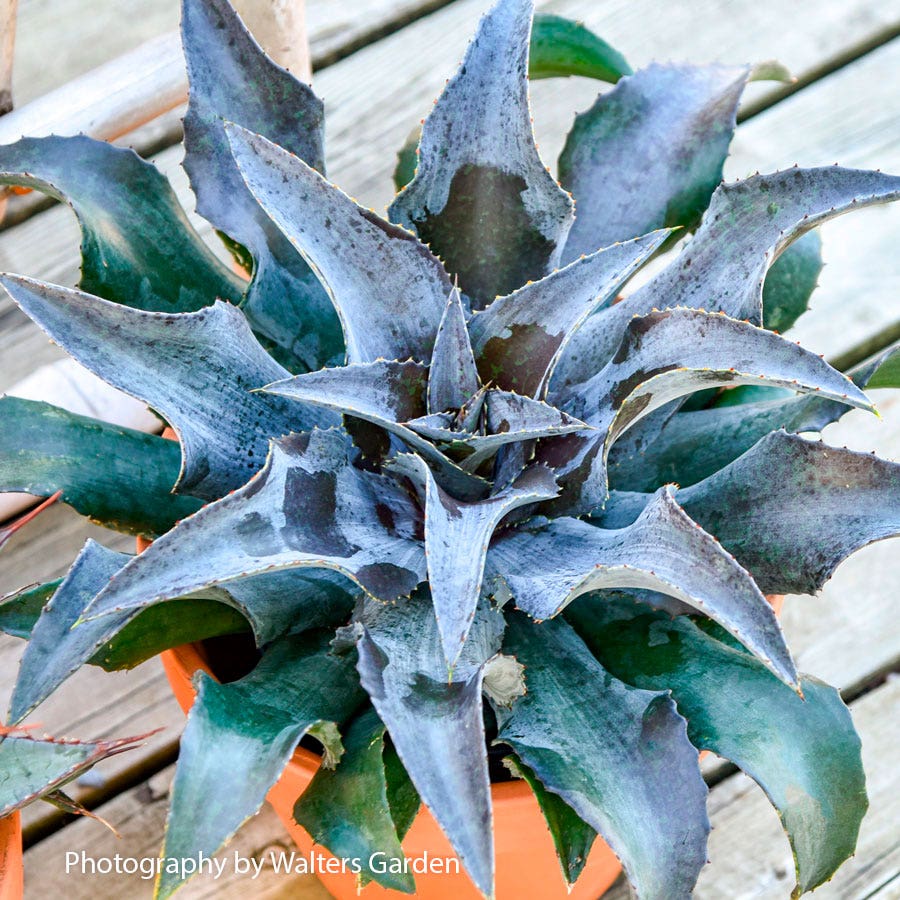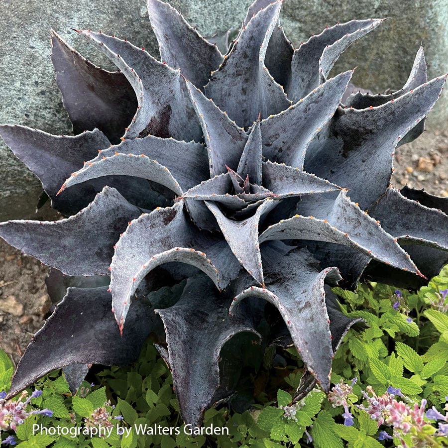 A member of the Proven Winners® Art & Sol® collection, 'Night Owl' is a compact succulent, reaching 6 to 8 inches tall and 16 to 18 inches wide. 'Night Owl' mangave adds bold architectural symmetry to garden or container with its dramatic rosette of broad leaves that looks amazing from any angle. Thick and arching, the recurved leaves have undulating, spiny margins and a nearly black hue from heavy dark purple spotting, which will be most prominent when grown in full sun.