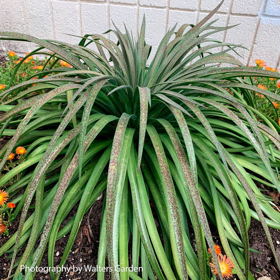 A Proven Winners® and a member of the Art & Sol® collection. Mangave 'Bad Hair Day' is a succulent herbaceous tender perennial grown for its basal rosette of soft, flexible, gracefully arching foliage. The long, narrow leaves are multicolored. Each lime green leaf exhibits light blush-red spotting that becomes distinct toward the tip and intensifies in strong ultraviolet light.