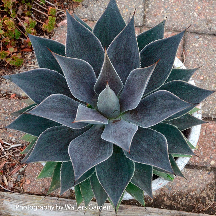 A Proven Winners® and a member of the MAD ABOUT MANGAVE® collection. Mangave 'Lavender Lady' is a succulent tender perennial grown for its solitary basal rosette of short, broad, nearly flat fleshy foliage. New leaves are smoky purple and develop subtle, irregular burgundy purple spots as well as soft, flexible tiny white spines along the margins. Each ovate leaf also sports a cinnamon brown terminal spine. As the leaves age, they lighten to green, giving the plant a two-tone effect.