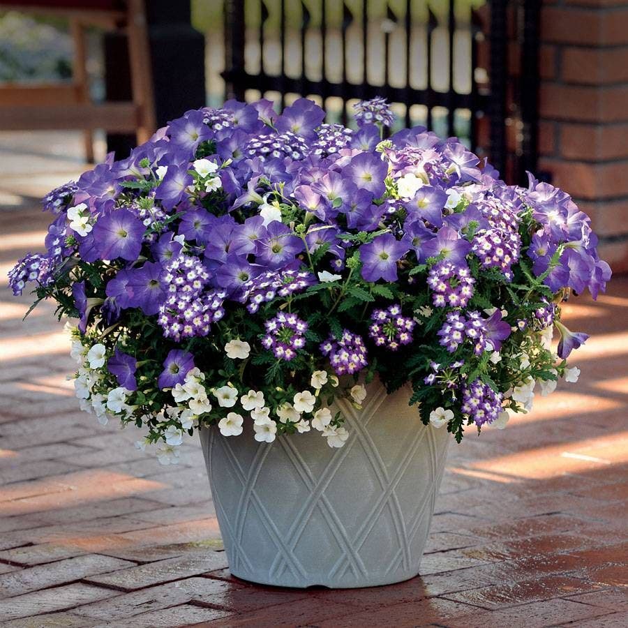 This sun-lover combines trailing, mounding, and versatile habits for best effect. Petunia Flash Mob Bluerific is the diva of the group, setting big blue blooms from late spring 'til frost on bushy, continuously flowering plants 10 to 16 inches high and 20 to 20 inches long. These flowers tower above the white Calibrachoa, which is neatly, densely mounded and forms the perfect backdrop for all this cool color. Finally, versatile Verbena Aztec® Violet Wink is a bicolor beauty that bees and butterflies love, with a habit both mounding and trailing!