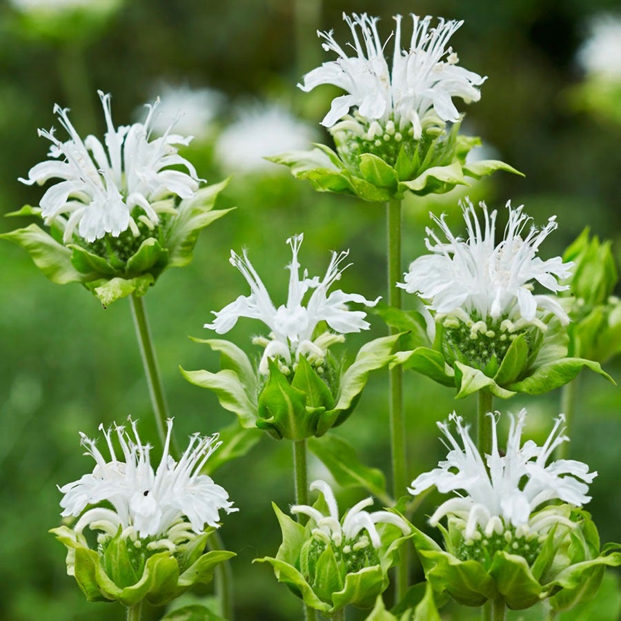 Monarda Ice Out Bee Balm is a native hybridized wildflower that grows 36 to 48 inches tall and blooms in July and August. Borne atop square stems, large, decorative clusters of tubular flowers appear in dense, rounded, terminal tufts. Their bright, cool-white color; citrusy, tea-like scent; and rich nectar attract bumble bees, butterflies, and hummingbirds to the garden. The flowers are edible, along with the aromatic, mint-scented leaves, which are used in teas, beverages, and desserts.