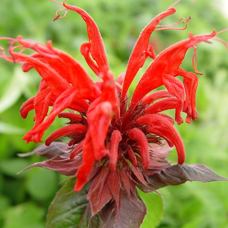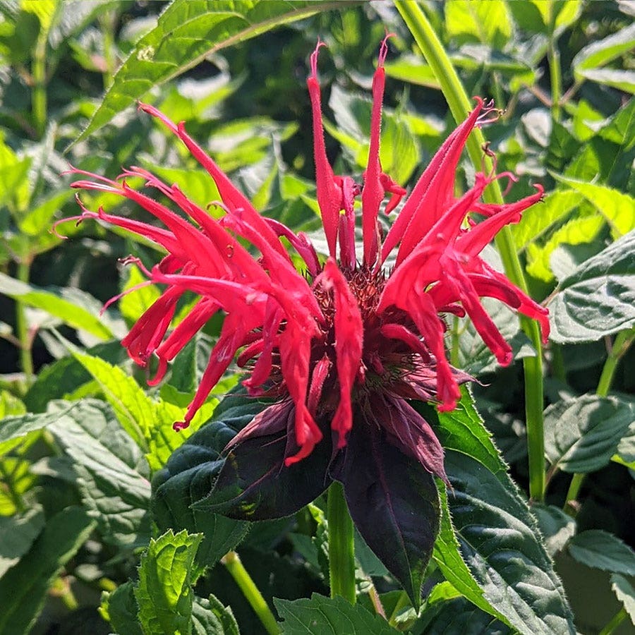Monarda 'Jacob Cline' is a showy perennial blooming summer to early fall in enormous boldly colored, shaggy red flowers above dark-purplish bracts. Borne singly atop long, willowy, square stems, the eye-catching, nectar-rich blossoms come in abundance; attract tons of bees, butterflies, and hummingbirds; and make excellent cuts for vase or arrangements.