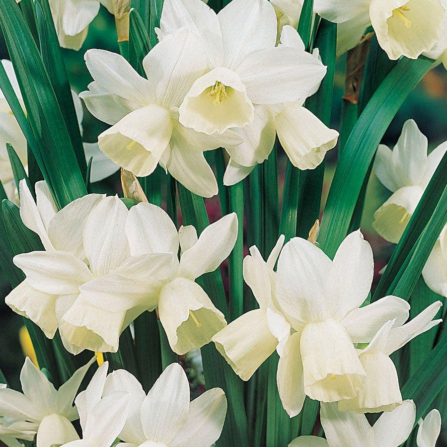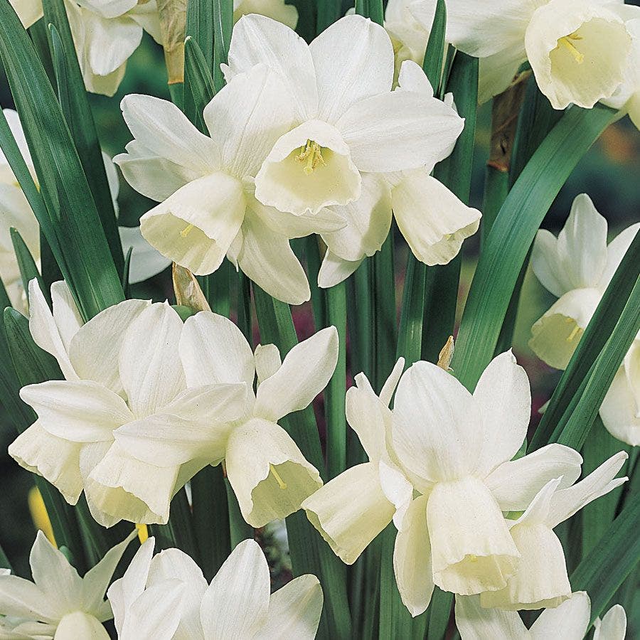 Narcissus 'Ice Wings' is an affordable perennial that easily covers a large area of ground. The tubular flower is wonderfully fragrant, but doesn't attract pests, such as deer and rodents. Four or five bulbs should be planted per square foot in soil with an average amount of water. The garden almost glows with these bright flowers, which bloom in mid-spring. Also known as "Angel's Tears," Narcissus 'Ice Wings' nod down and delicately sway in the wind.