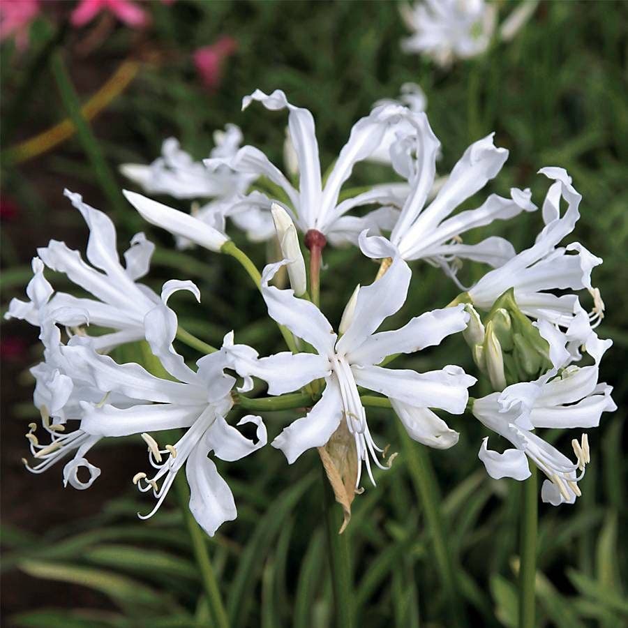 Nerine bowdenii 'Alba' bears crisp, pure-white, star-shaped blooms on sturdy stems. It makes a fantastic addition to the late summer border and makes an excellent cut flower.