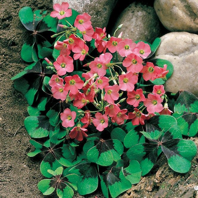 Oxalis 'Iron Cross' is often known as Good Luck Plant and it will certainly bring luck to your landscape. It's a bulbous perennial that forms a lush mount of rich green leaves that are each composed of four heart shaped leaves, each with a dark purple center. The burgundy marking across the center of the leaves is reminiscent of a cross. During the day the leaves open out to receive sunlight but at night they retract and fold up like little umbrellas, adding even more interest to this unique plant. From early summer until frost, the handsome foliage is topped by plenty of trumpet shaped bright pink blooms. Oxalis is easy to grow and not invasive and it makes a colorful, interesting addition to rock gardens and offers a long season of interest when it is grown in containers. Add it to your landscape for a little bit of luck and a lot of fun!
