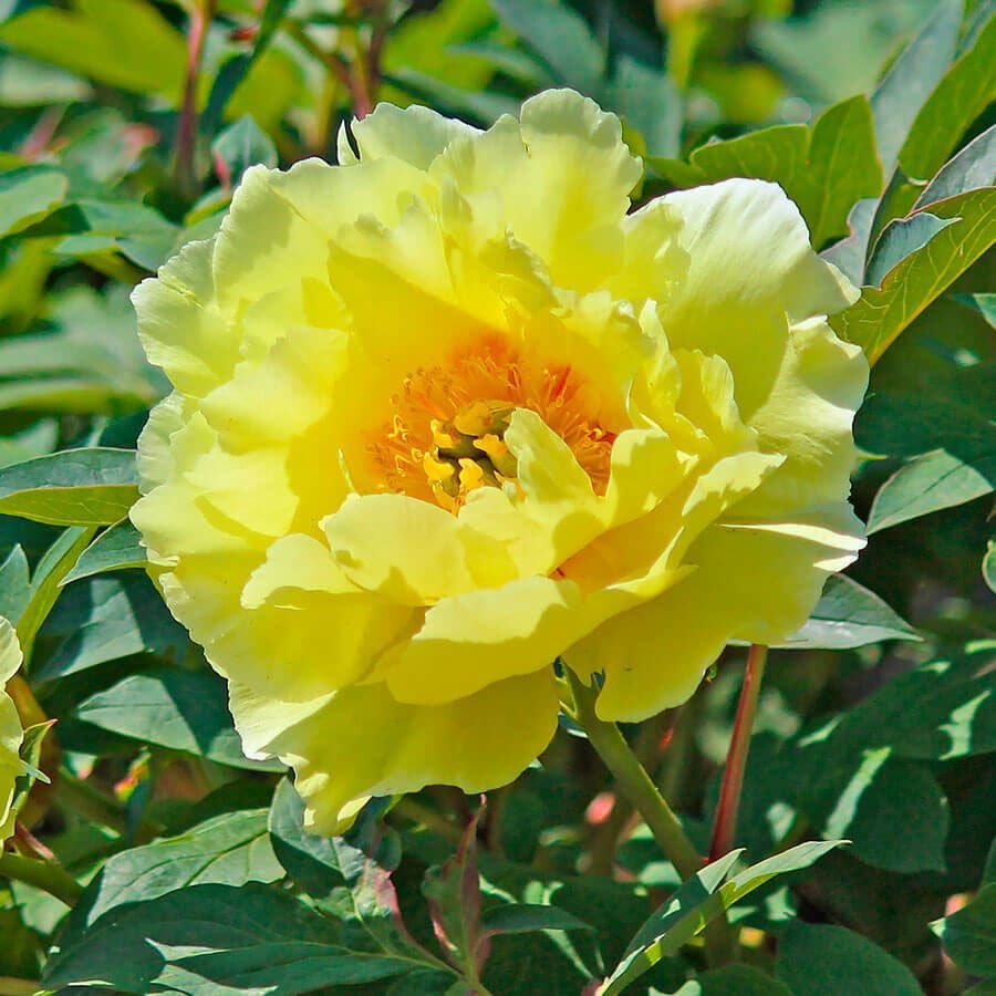 An upright form, its stems and branches growing upward, 'High Noon' is an excellent display plant. The medium green foliage of deeply divided, oval- to lance-shaped leaflets remains throughout the season, so it's attractive even when not in bloom. Slow growing, at maturity, the "tree" reaches between 3 and 6 feet tall and 3 feet wide, and with the lower leaves removed, exposing its woody structure, it will have the appearance of a small tree and add nice architecture to the garden.