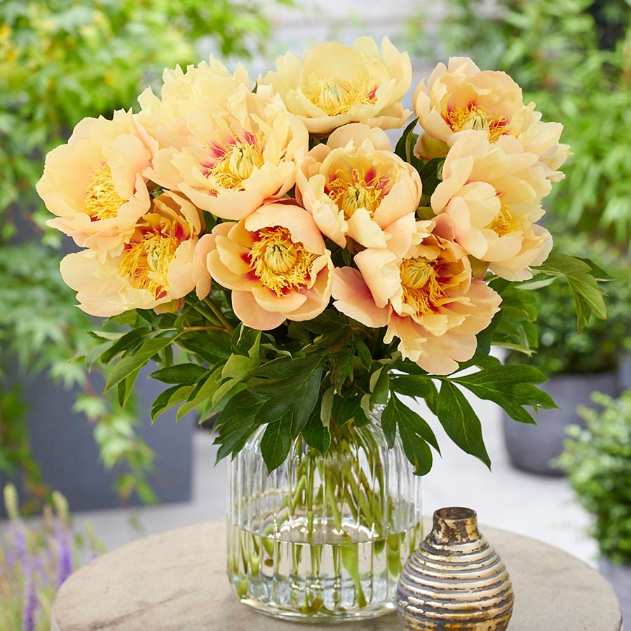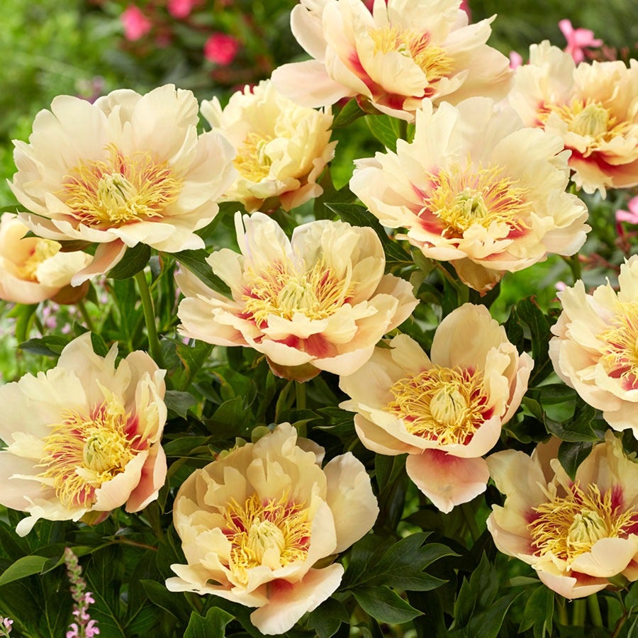An Itoh peony, also called an intersectional peony, 'Prairie Charm' is a rare hybrid cross between a tree peony and an herbaceous peony, exhibiting the best qualities of both. Small and bushy, 'Prairie Charm' peony fits almost anywhere and makes a stunning specimen in mixed beds and borders. But it's shown to best effect when grouped and makes a lovely low hedge or back drop for spring bulbs. With proper placement and care, this sturdy, cold hardy (Zones 3-8) plant can live for 100 years or more.