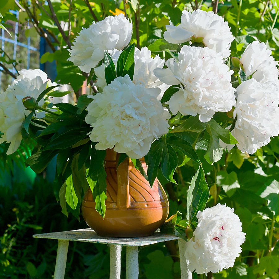 Peonies are one of the longest-lived perennials, lasting for generations and exhibiting enormous, luxurious blooms with the look, fragrance, and staying power of the finest roses. Discover the winning merits of this old-fashioned favorite in your own garden with the stunning 'Shirley Temple'. Huge, fully double, white blooms with a delicate hint of rose coloring are backed my a mound of dark, glossy, green, deer resistant foliage. Peonies make an excellent background plant for spring bulbs, a spring specimen in beds and borders, and are simply a classic for cut flower arrangements. They will thrive in full sun and moist well drained soil. Let this stunning peony fill your garden with romantic blooms this season.