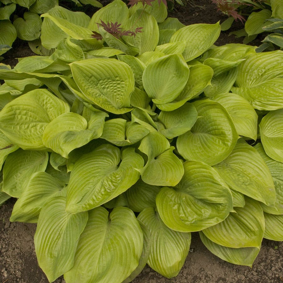 We hear more and more raves about the performance of this huge-leaved cultivar. Heavy, 2-foot light green leaves make a striking display, enhanced by lavender flowers in late summer. A strong grower in half sun. 3 feet tall and 5 feet wide. Quite slug- and snail-resistant.