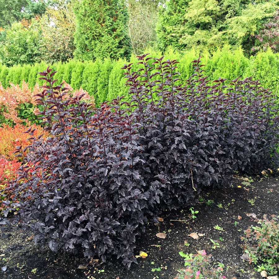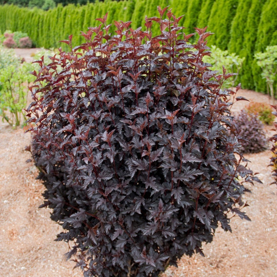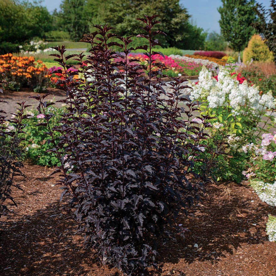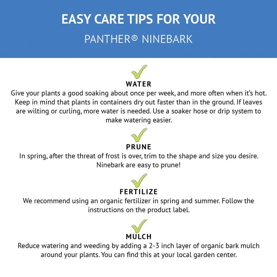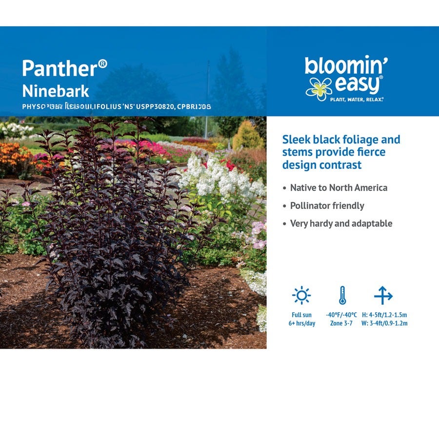 A Bloomin' Easy® variety, Physocarpus Panther® (ninebark), a fierce, sun-loving beauty is a triumph of foliage interest. Its frazzled inky leaves are a delectable deviation from typical greenery of the garden and its columnar habit sends it rising over the landscape like an obsidian tower. Its regal presence is broken only by the occasional subtle sprays of pink flower that blooms beautifully in the summer. This easy to care for shrub is also disease and pest resistant. It does best in full sun and is the perfect pairing of light-colored flowers and dark foliage. While this elegant perennial earns plenty of attention, it does not demand any actual maintenance so you can just sit back and watch ii work its magic.