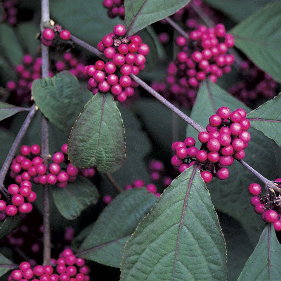 A member of the Verbena family, this lovely open habit shrub features smooth red-brown bark, ovate, dentate leaves and, most importantly, the delightful berries for which it is named! The berries grow in dense, glossy bunches right along the stem, the color varying from deep purple to a fuchsia pink. The graceful, arching stems are attractive in their own right, but reach the pinnacle of beauty in the fall after they defoliate and reveal their treasure troves of berries!