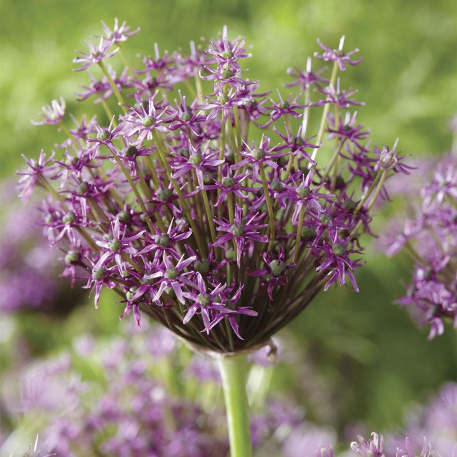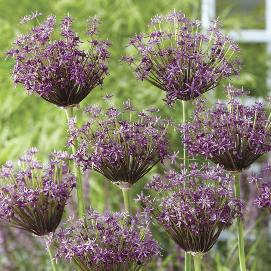 An Allium aflatunense species, commonly called ornamental onion or Persian onion, Miami is a bulbous perennial with an upright habit. Alliums are in the same family as many familiar edible plants, such as garlic, onions, chives, and shallots; but ornamental alliums add an interesting architectural element to the garden with their pompom blooms on tall, naked scapes. Miami naturalizes easily once established, with bulbs multiplying and plants getting more numerous each year. Plant these beauties in spectacular sweeping drifts, cluster them in flower beds, weave them through the back of borders, or place them in deep patio pots. They make gorgeous layered lasagna plantings with muscari and anemones.