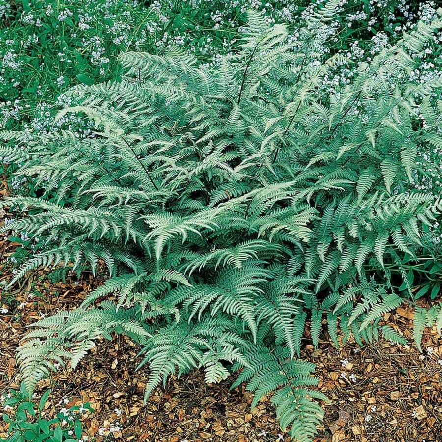 Other than the appearance of its extremely fine foliage, there is nothing delicate about this cold hardy, low maintenance perennial. Athyrium 'Branford Beauty' is one of the most dramatic, elegant, and exotic ferns available. Its rosy stems, upright and arching, carry graceful fronds, finely divided and softly hued in muted tones of silver, grey, and green, with burgundy tinges. Low growing and spreading, to approximately 24 inches high and wide, it forms a shapely mat, dense right to the ground.