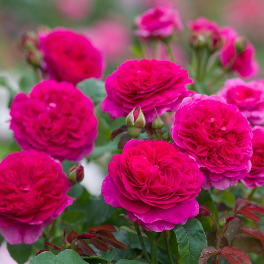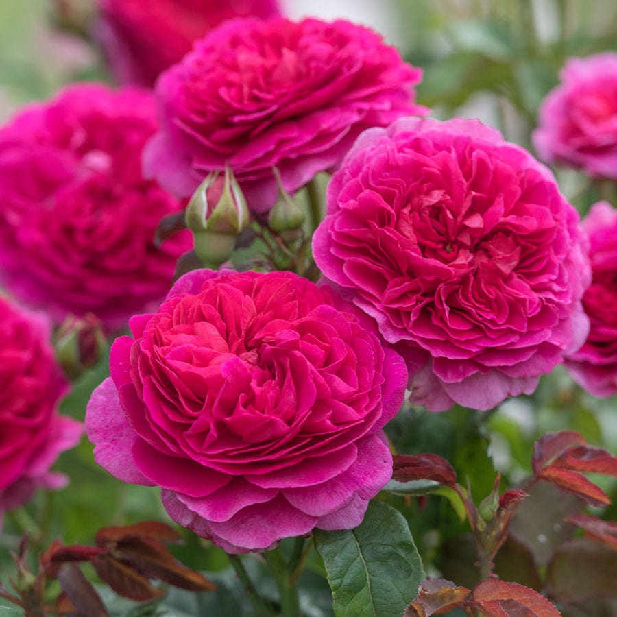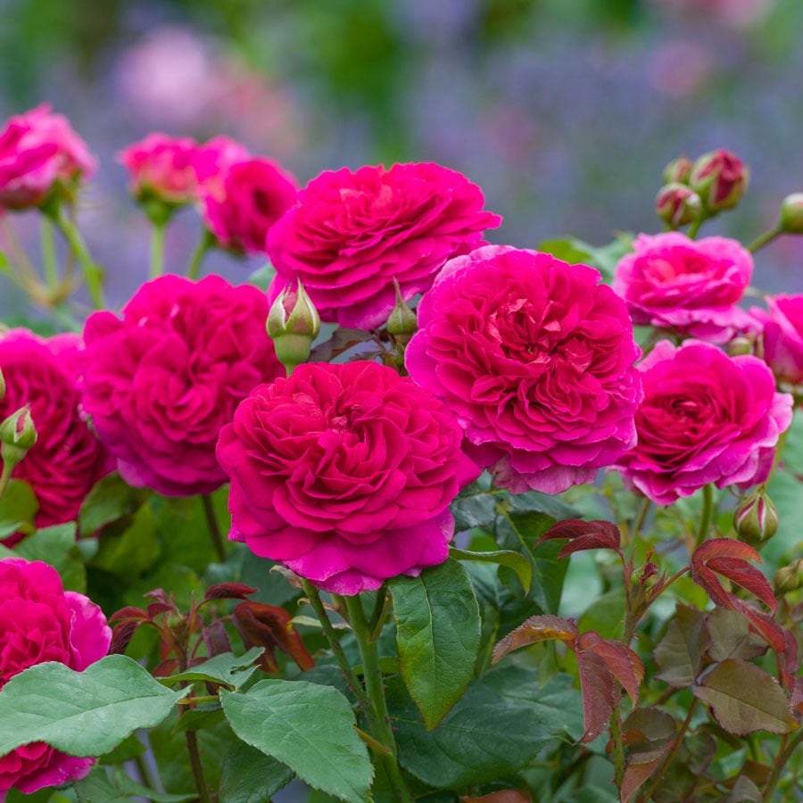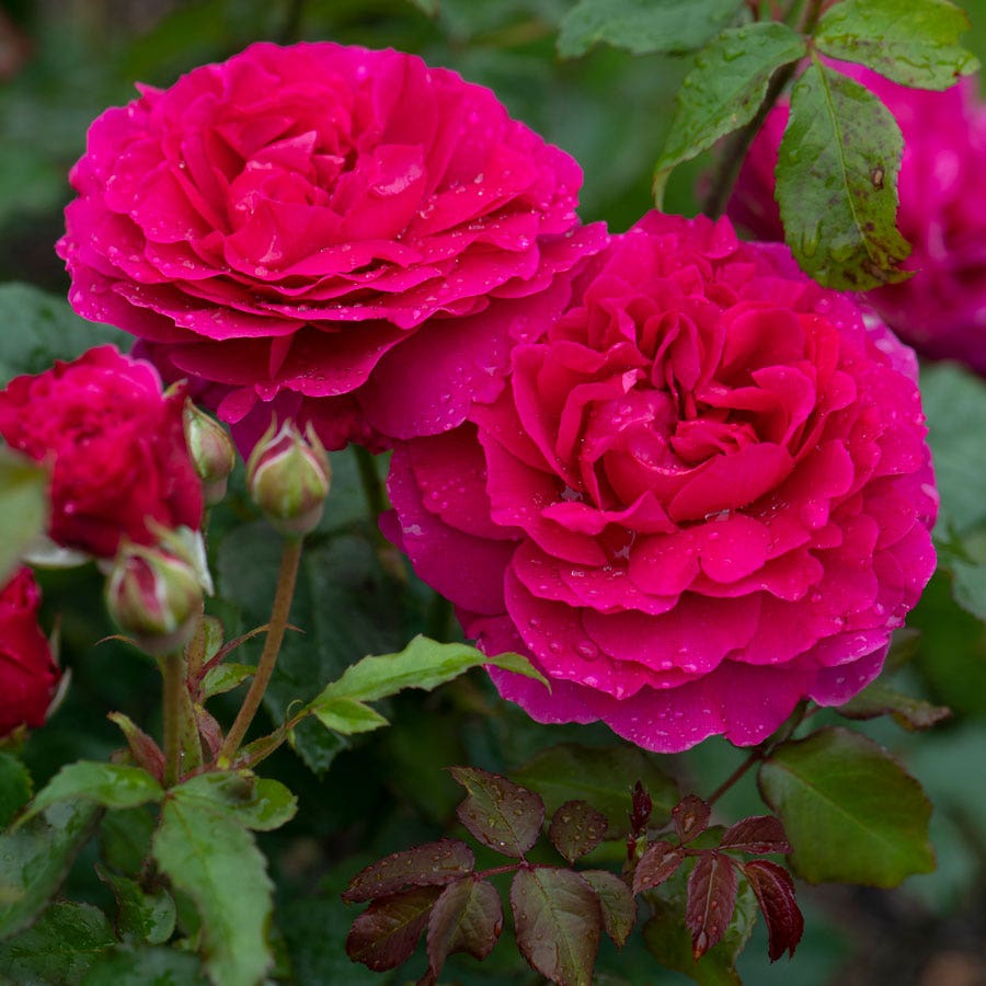 One of the most interesting of David Austin's® English shrub roses, Gabriel Oak has a beautiful overall look and is a good all-around rose. The leaves, borne along mulberry purple stems, are rich green with dark edges. The growth tips are a flame red that highlights the sumptuous deep, dark pink to pinky-red hues of the blooms. A relatively late bloomer, it begins flowering in early summer and continues flushing through mid-autumn, setting clusters of 2- to 3½-inch rosetted blossoms boasting 100+ petals and an intoxicating fruity fragrance with blackberry notes. With their stunning color and fabulous fragrance, they make excellent cut flowers for bouquets and mixed floral arrangements.