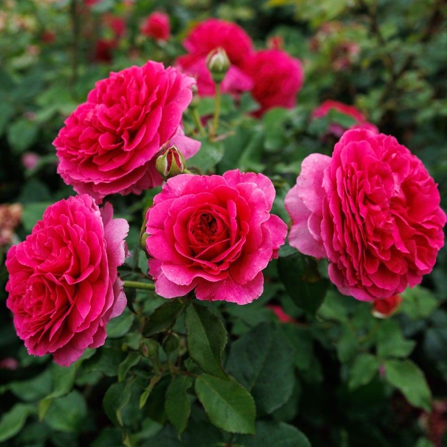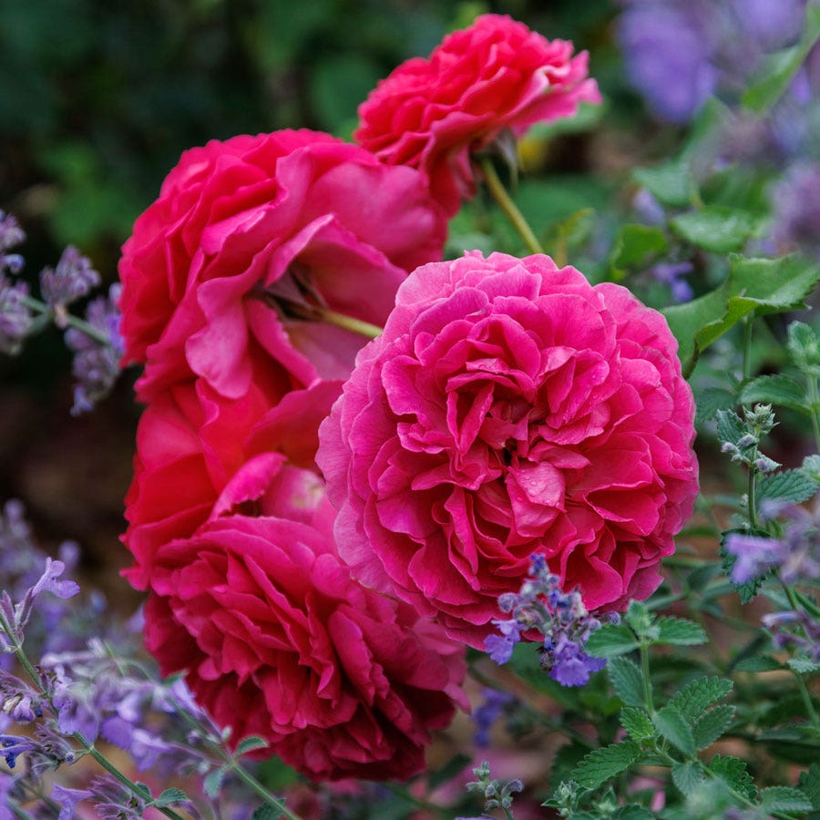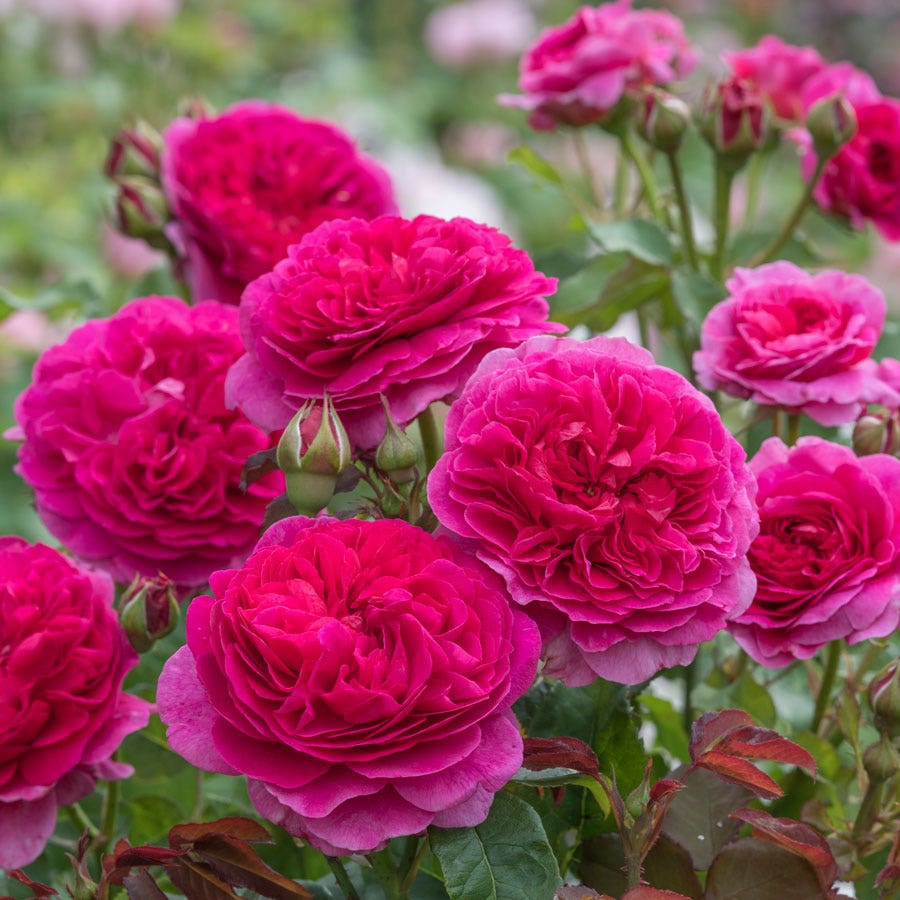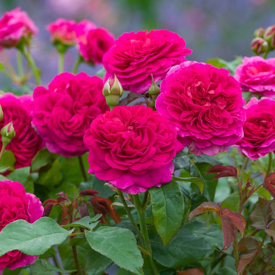 One of the most interesting of David Austin's® English shrub roses, Gabriel Oak has a beautiful overall look and is a good all-around rose. The leaves, borne along mulberry purple stems, are rich green with dark edges. The growth tips are a flame red that highlights the sumptuous deep, dark pink to pinky-red hues of the blooms. A relatively late bloomer, it begins flowering in early summer and continues flushing through mid-autumn, setting clusters of 2- to 3½-inch rosetted blossoms boasting 100+ petals and an intoxicating fruity fragrance with blackberry notes. With their stunning color and fabulous fragrance, they make excellent cut flowers for bouquets and mixed floral arrangements.
