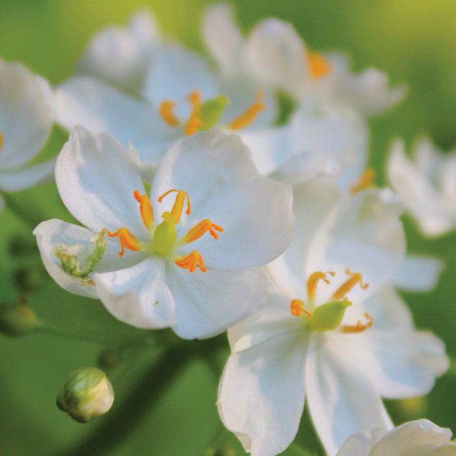 Diphylleia Skeleton Flower is a deciduous perennial that blooms early to midsummer, creating a decidedly Asian ambiance. The lovely little white blooms appear unassuminguntil it rains. That's when the magic happens. Tissue thin, the flowers become translucent when wet, leaving only the intricate "skeletal" veining and their yellow center clearly visible, giving the flowers the appearance of frosted glass.